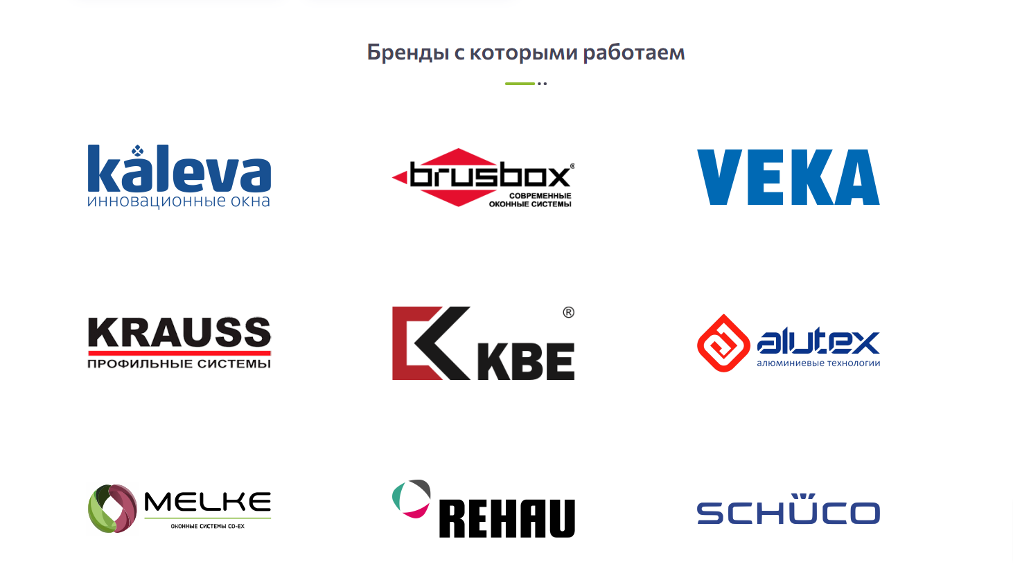 Далее на главной странице разместили раздел с логотипами компаний, с которыми сотрудничает «Окнориум». Это подтверждает использование только качественного оборудования от известных мировых брендов и сотрудничество с надежными поставщиками, а соответственно повышает интерес и доверие к компании.