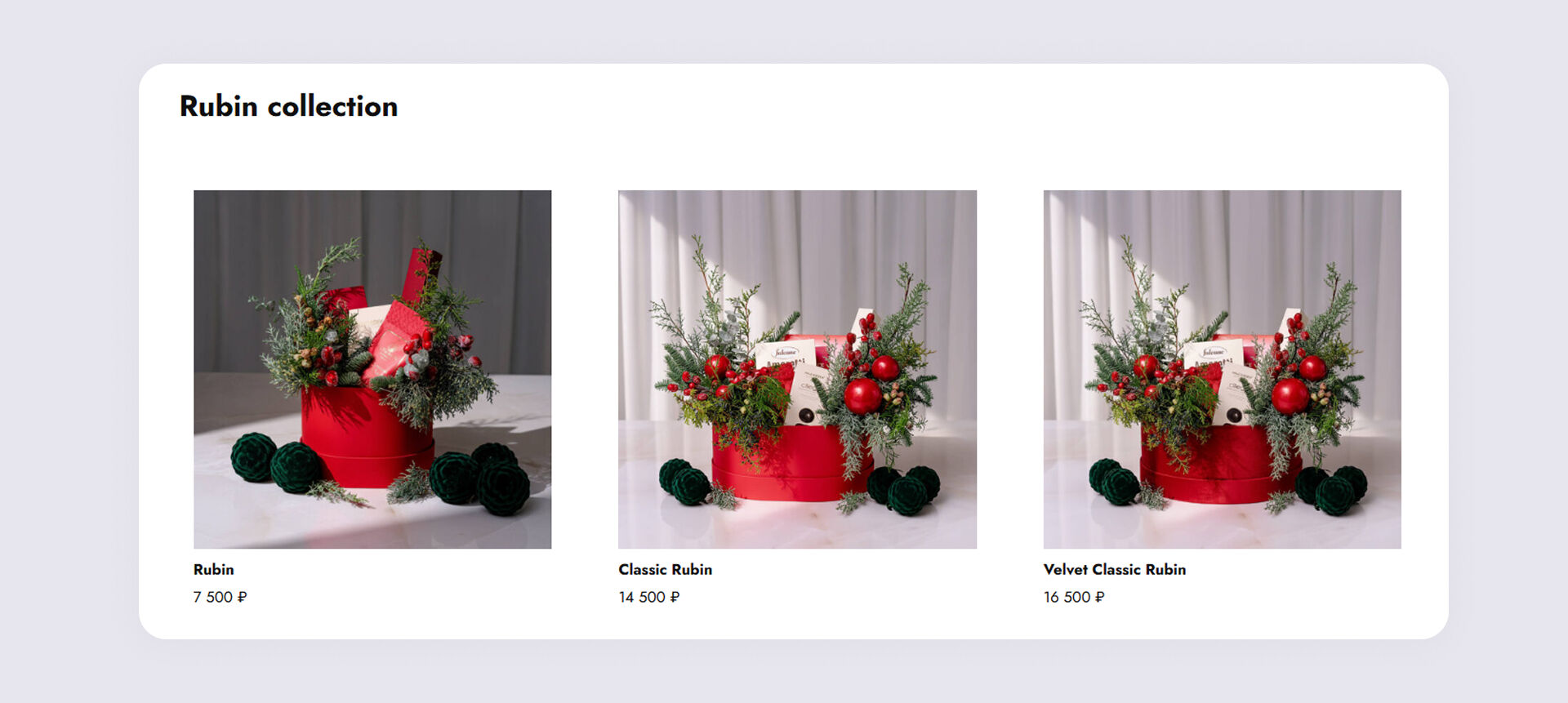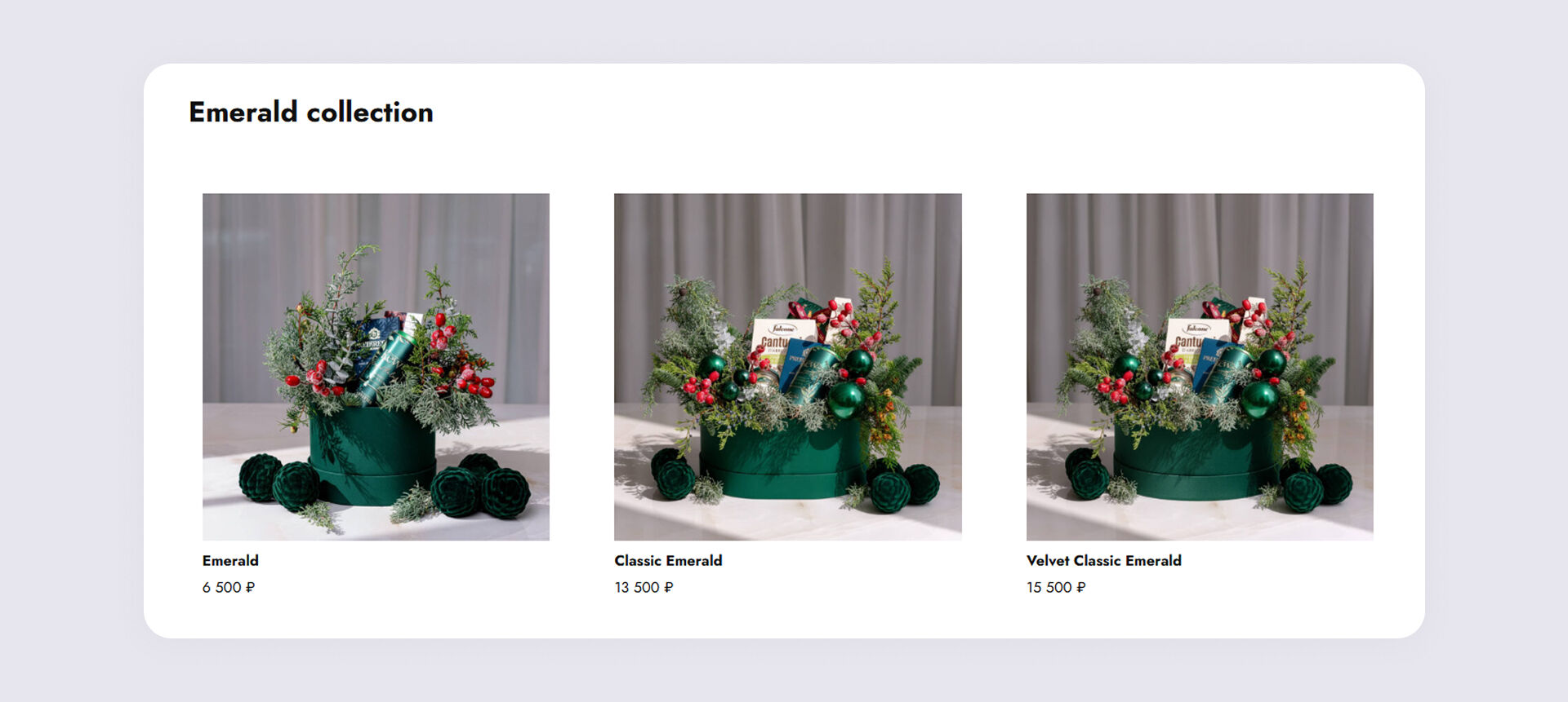 Далее идут крупные карточки карточки товаров, разбитые по коллекциям: