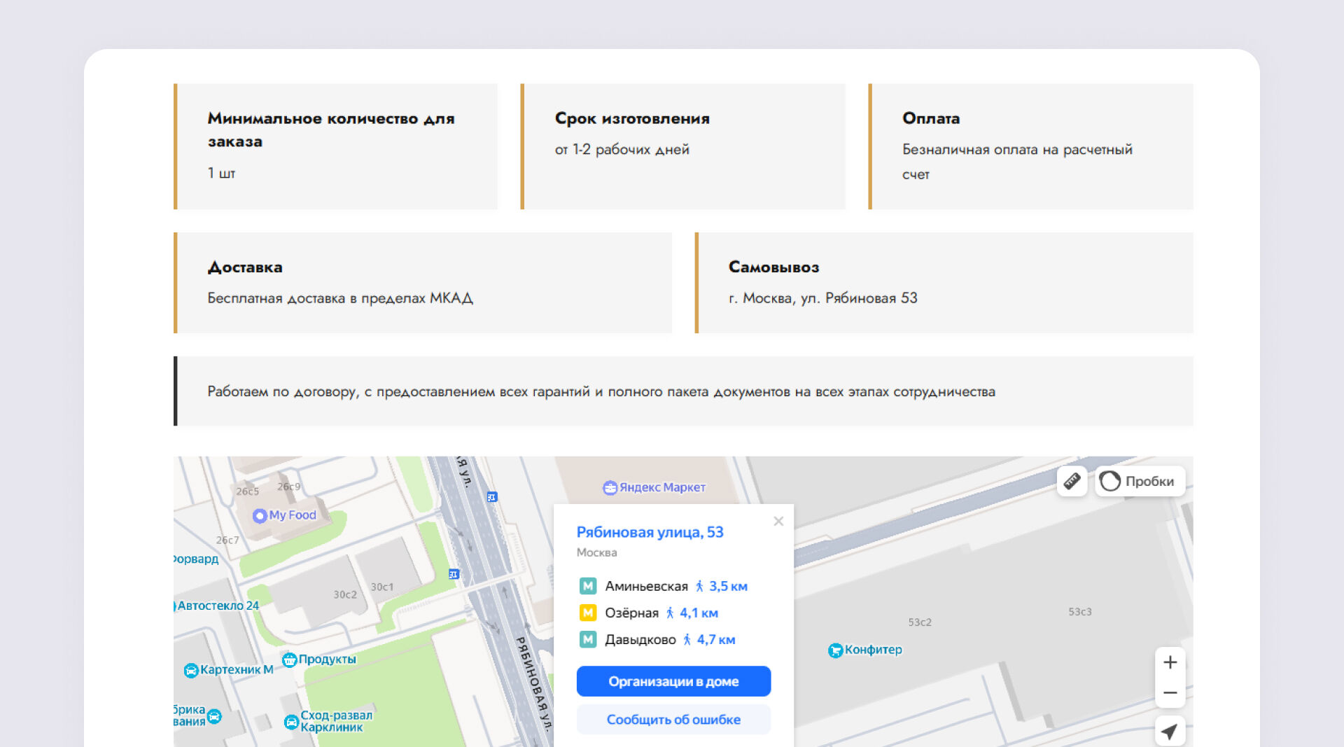 Основная информация, необходимая покупателю, с картой расположения склада самовывоза: