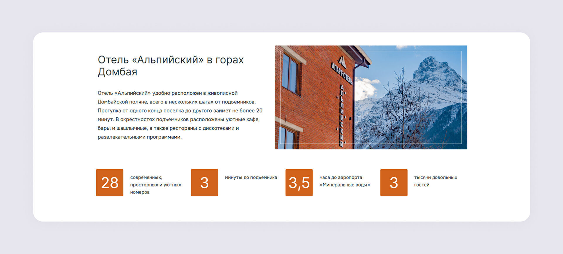 Для того, чтобы дать пользователю ещё больше полезной информации об отеле, мы добавили блок «О нас». В нём сделали упор на удобное расположение объекта и инфраструктуру вокруг.