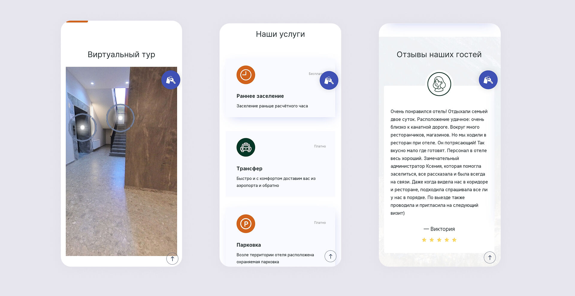 Одним из интересных решений стало размещение блока «Виртуальный тур», позволяющего пользователю буквально пройтись по отелю и почувствовать его атмосферу. Размещение виртуального тура на сайте увеличивает вовлеченность, улучшает пользовательский опыт, тур доступен 24/7, является конкурентным преимуществом, повышает конверсию и упрощает маркетинг.