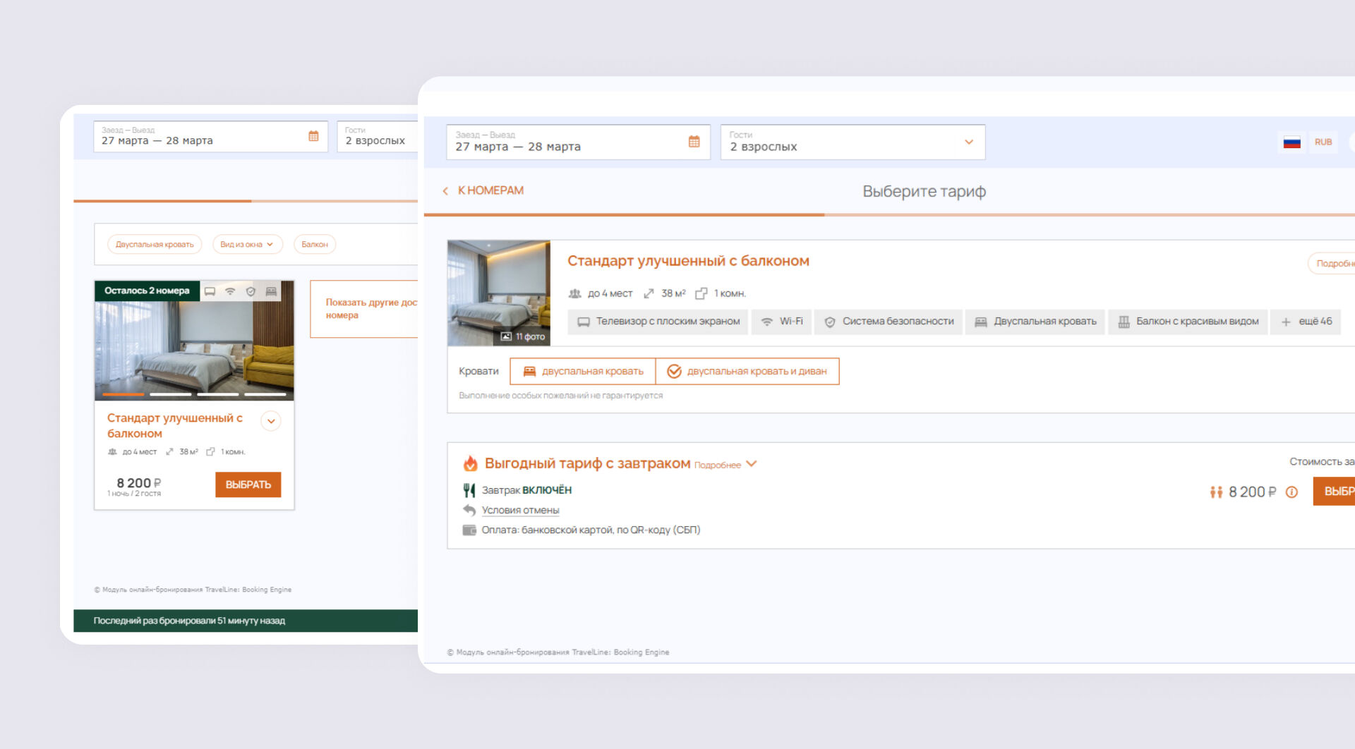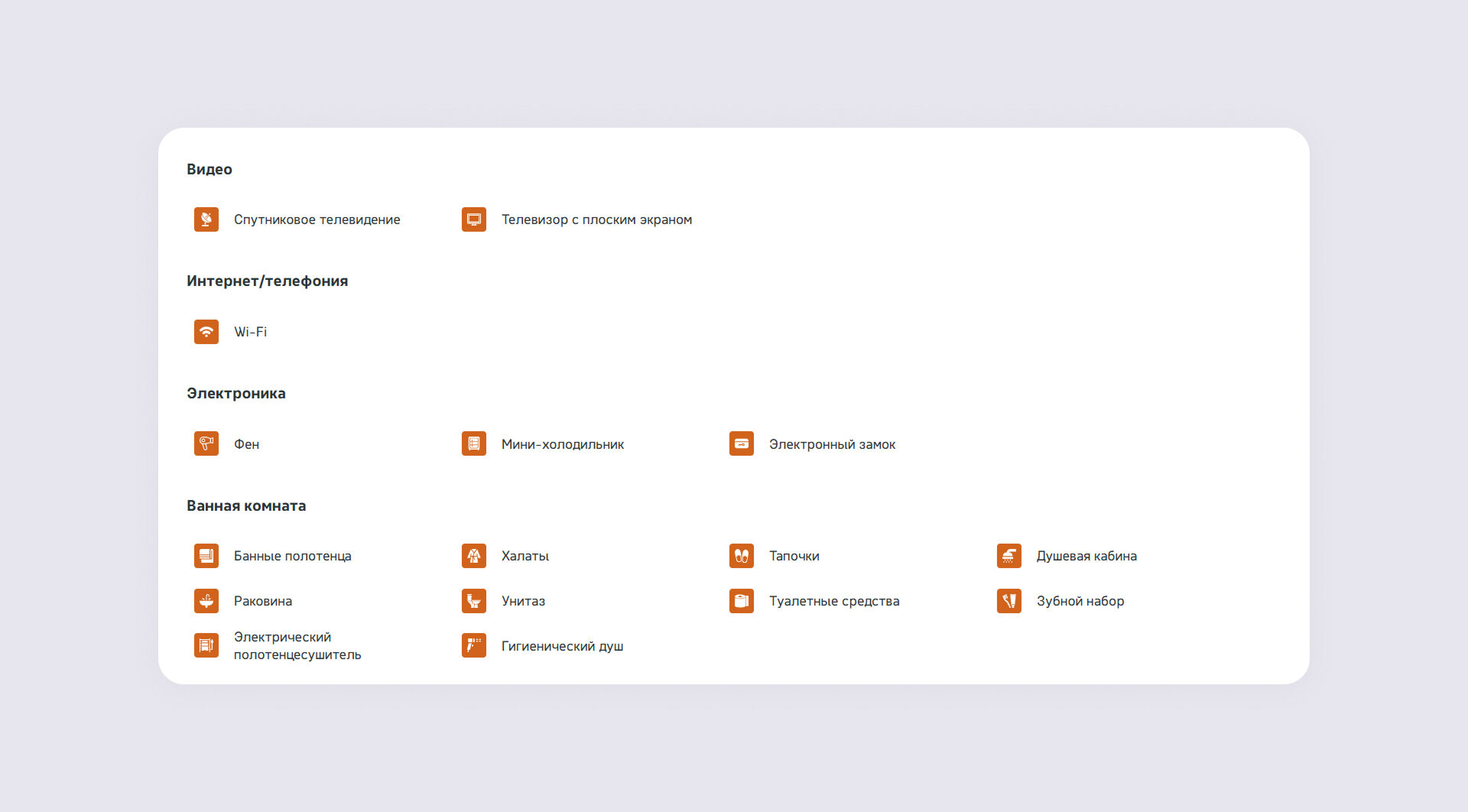 При выборе номера пользователю также представляется информационные карточки с их полным описанием и оснащением.