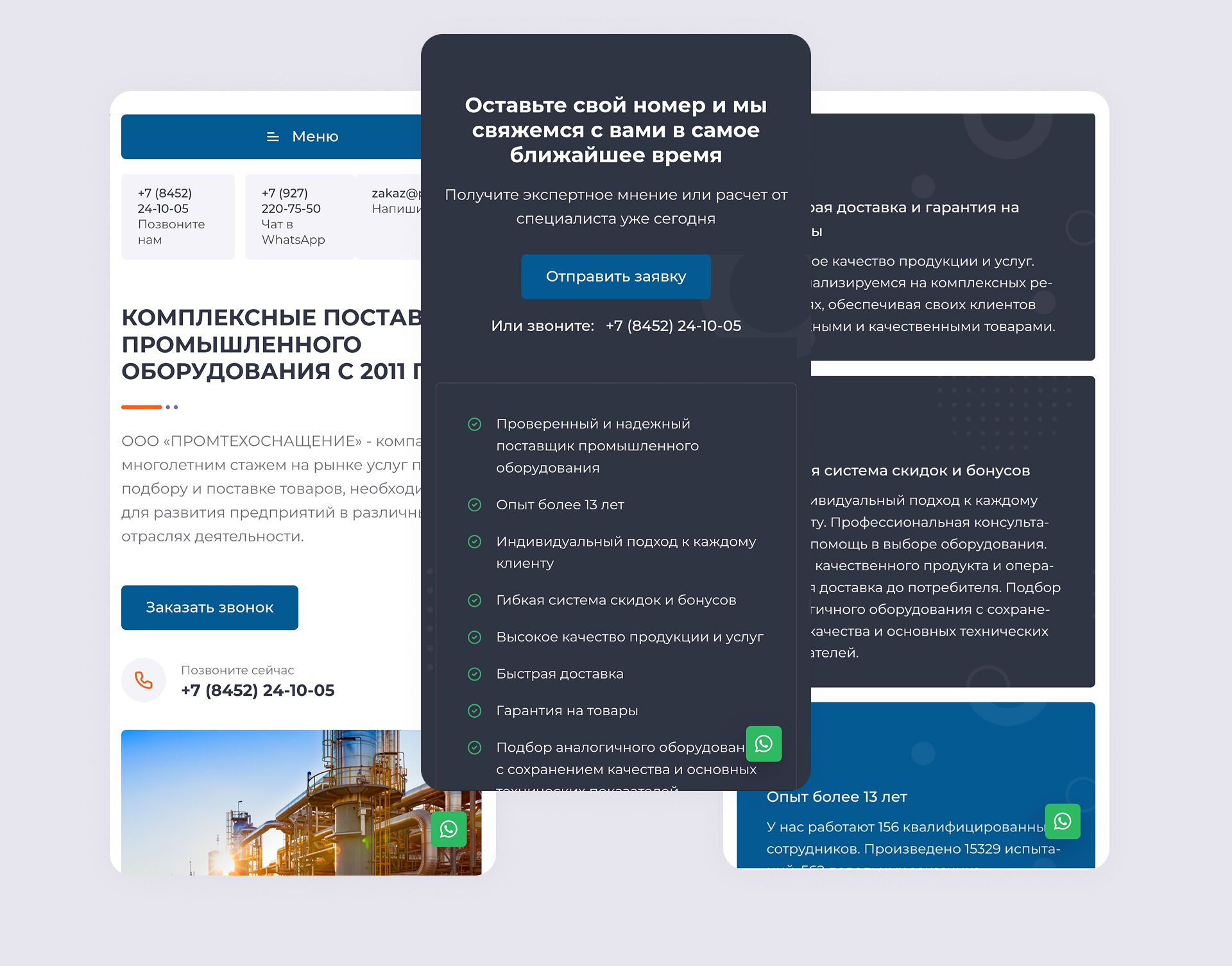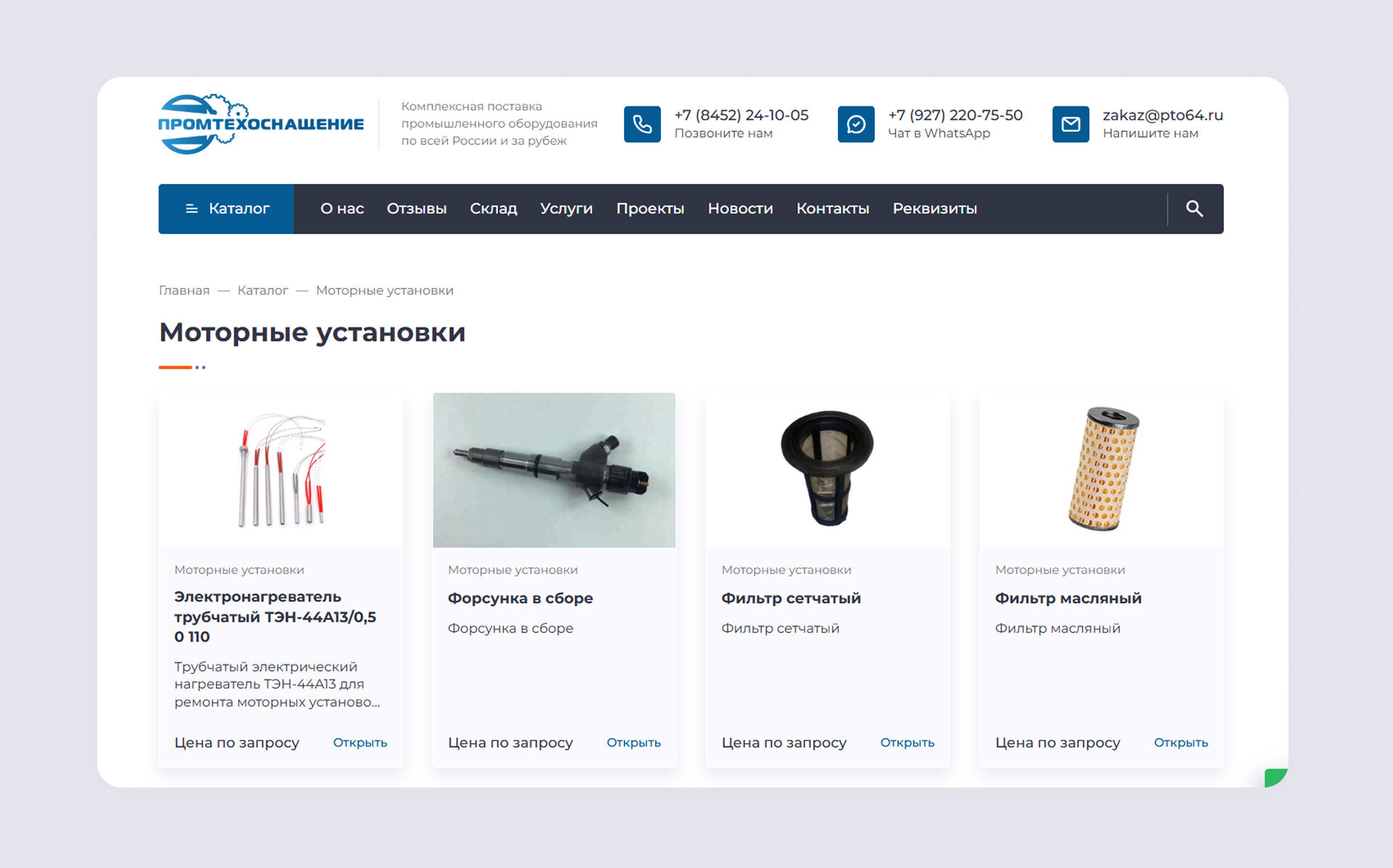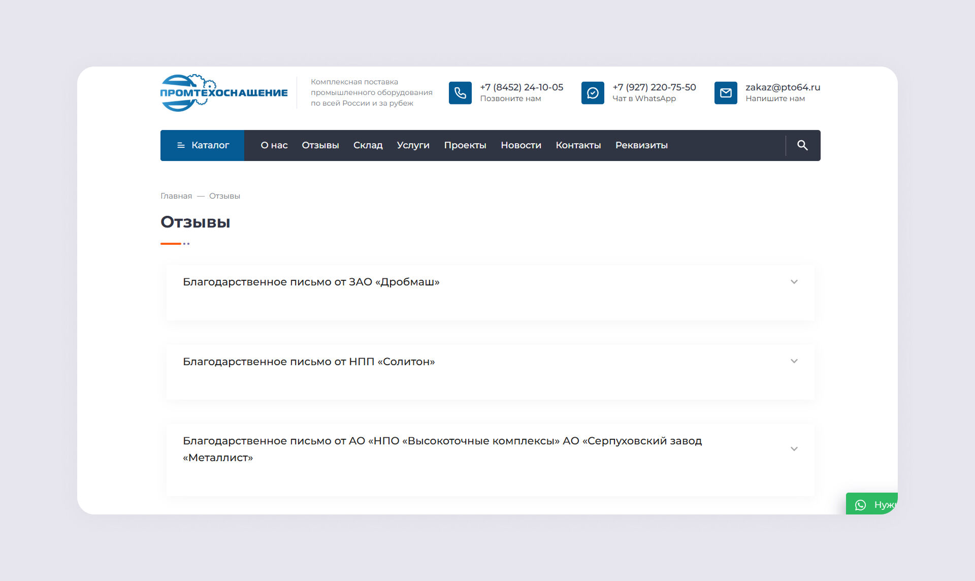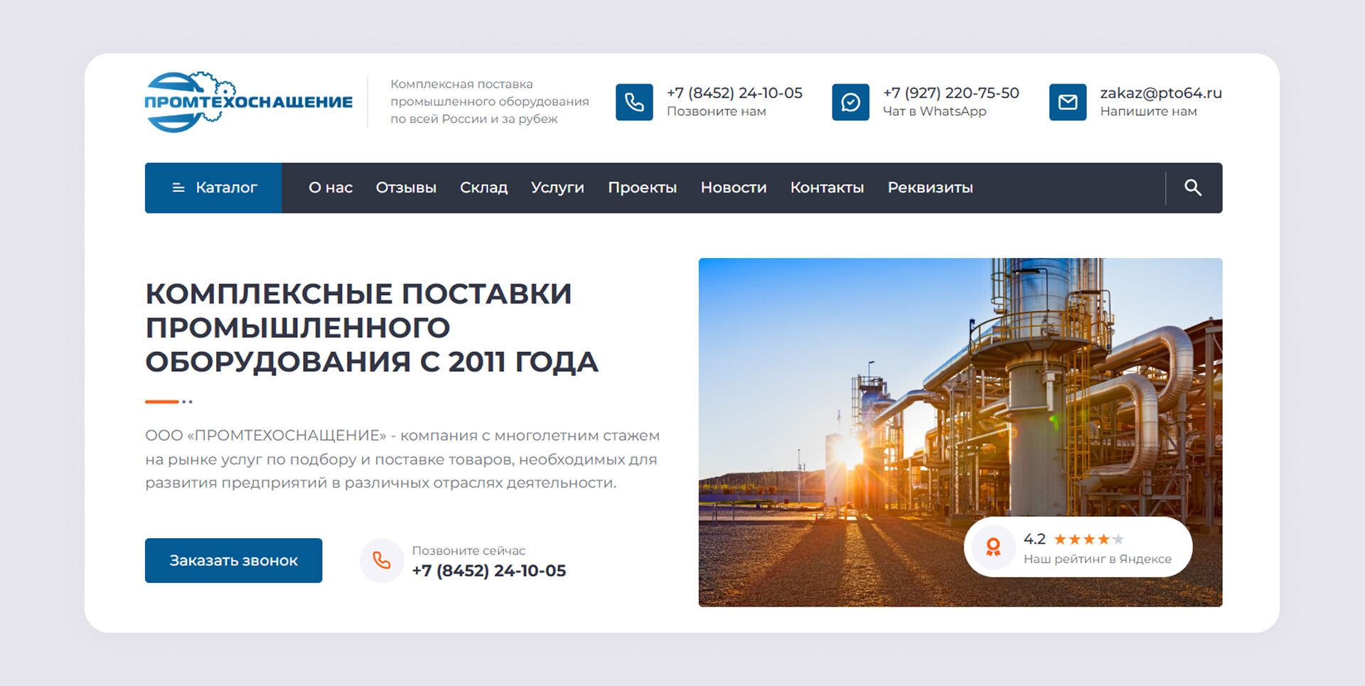 Создать сайт для компании ООО «Промтехоснащение», занимающейся комплексными поставками промышленного оборудования по всей России и за рубеж.