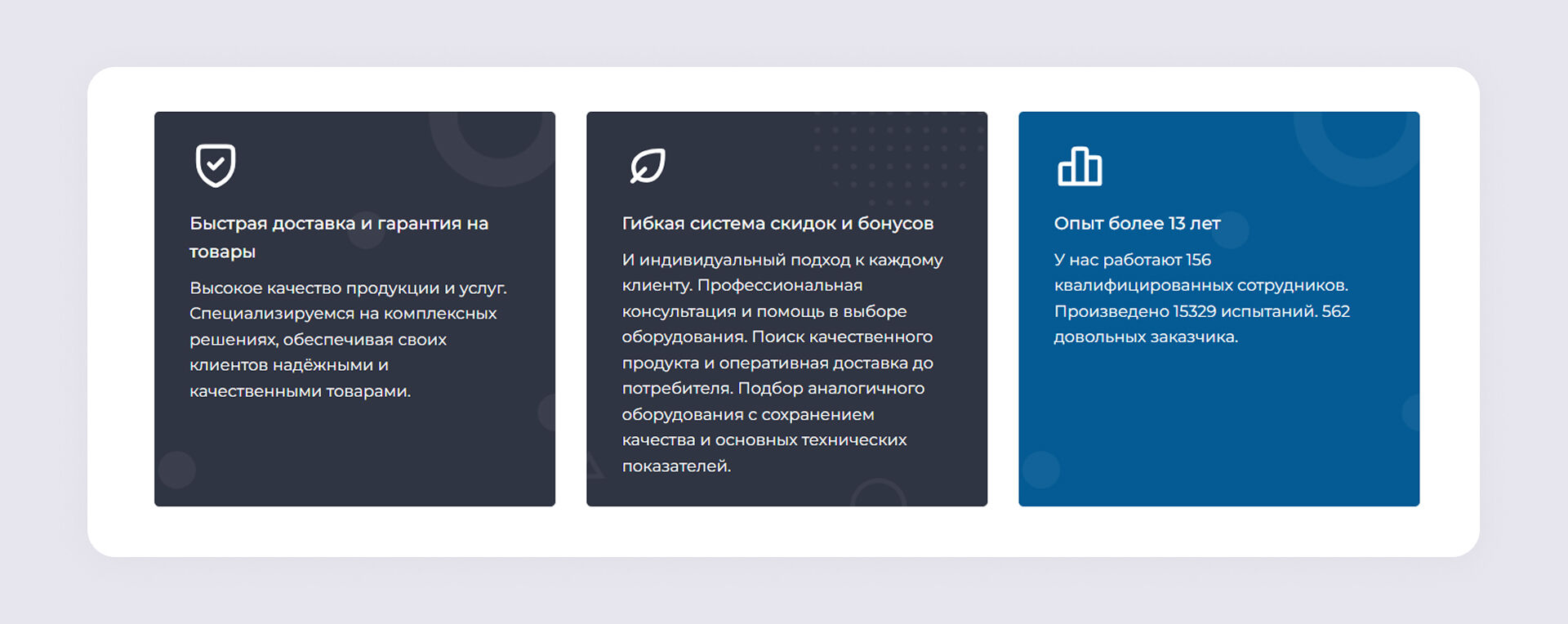 На главной странице разместили раздел с преимуществами. Он привлекает внимание благодаря лаконичным аргументам и контрастным цветам. Кроме того, преимущества сопровождаются иконками, что улучшает восприятие информации.