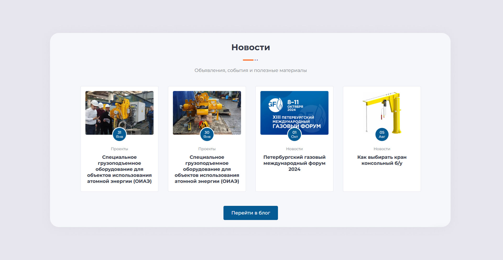 Ниже разместили блок с новостями. Этот блок позволит пользователям ознакомляться с актуальными объявлениями, событиями и полезными материалами, связанными с ООО «Промтехоснащение».