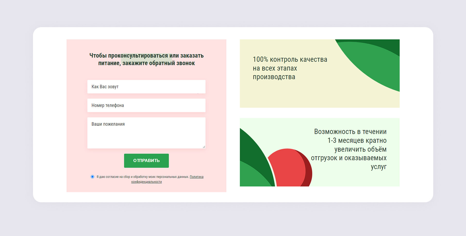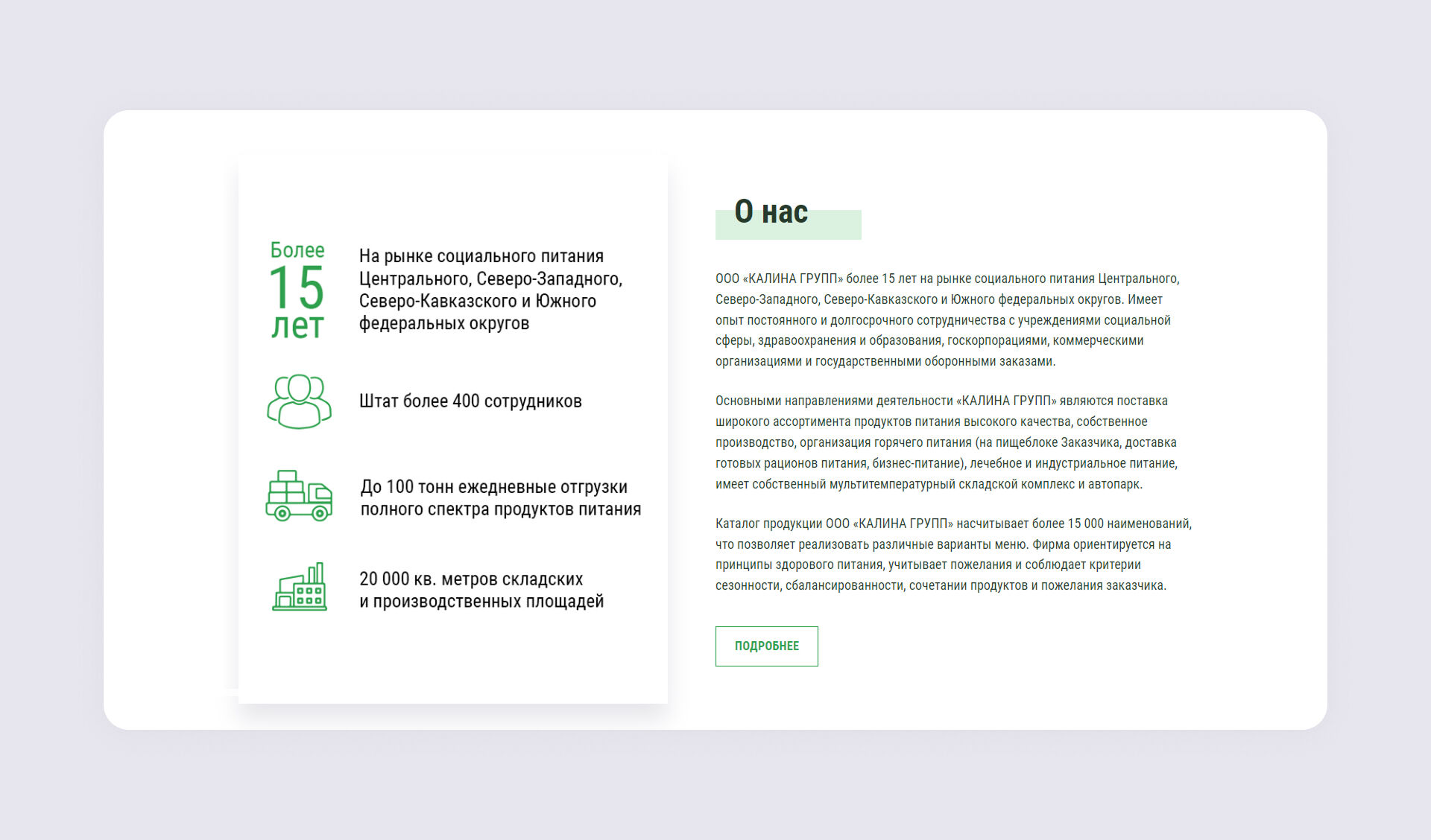 Также мы добавили блок с основными преимуществами компании и описанием её деятельности в блоке «О нас». Этот раздел содержит привлекательные графические элементы и достижения компании в описании к ним (география поставок и многолетний опыт в отрасли, площадь складских и производственных помещений, штат сотрудников и количество ежедневно отгружаемой продукции).