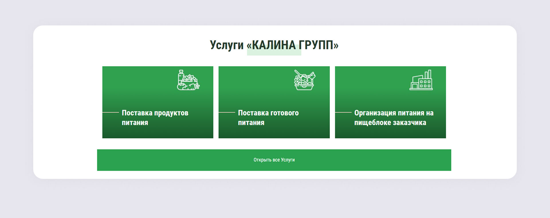 Далее добавили блок «Услуги «КАЛИНА ГРУПП». Данный раздел помогает пользователю легко и быстро выбрать наиболее подходящее для него решение. Кнопка «Открыть все услуги» ведёт пользователя к полному перечню услуг.
