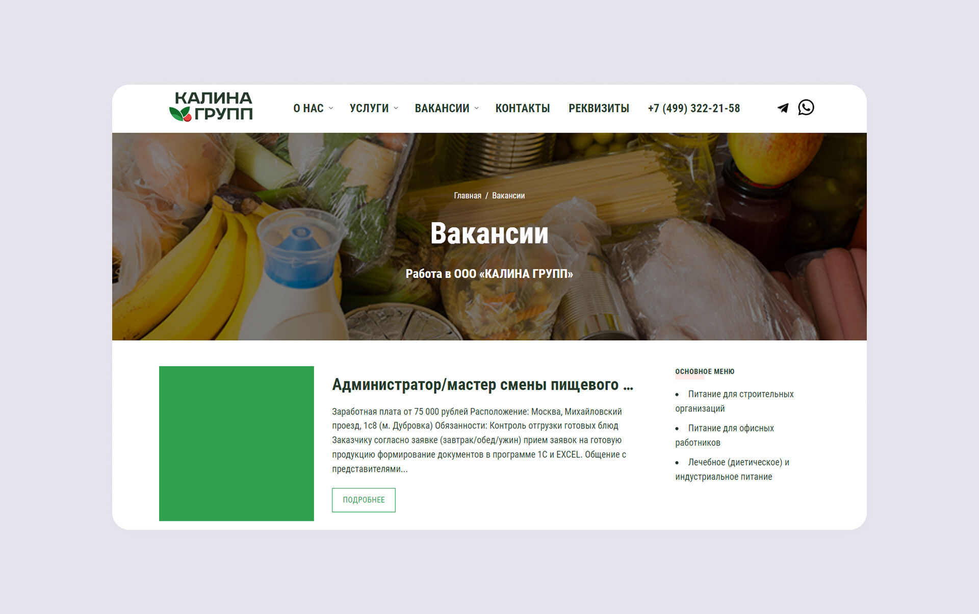 Дополнительно добавили вкладку «Вакансии». Благодаря данному разделу потенциальным соискателям доступна полная информация о возможности трудоустройства в ООО «КАЛИНА ГРУПП».
