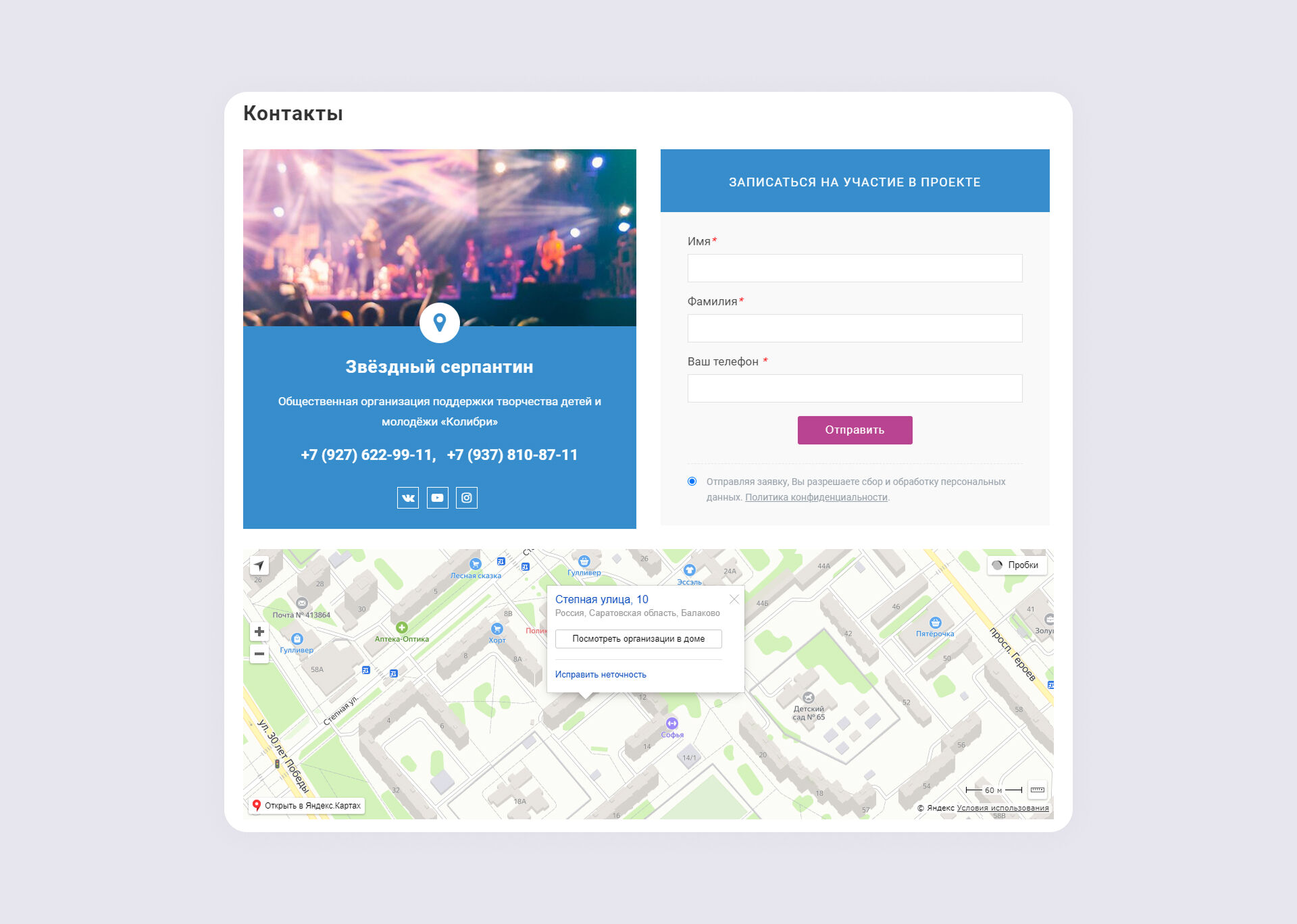 Обязательная ссылка на форму с заявкой на участие, которая ведет на страницу с контактами