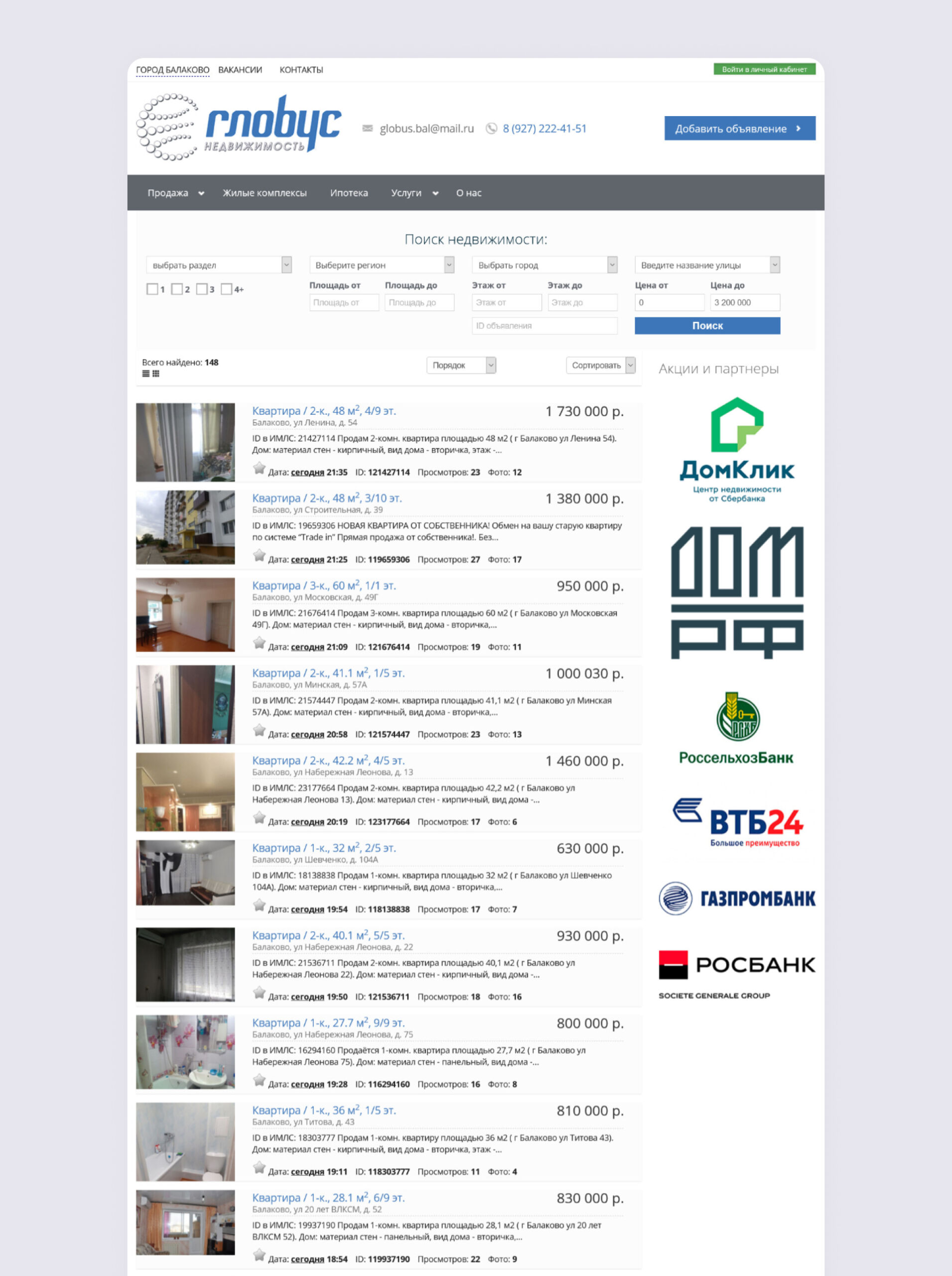 - Разработан сайт для агентства недвижимости с каталогом объектов и интеграцией с CRM системой агентства — globus-balakovo.ru