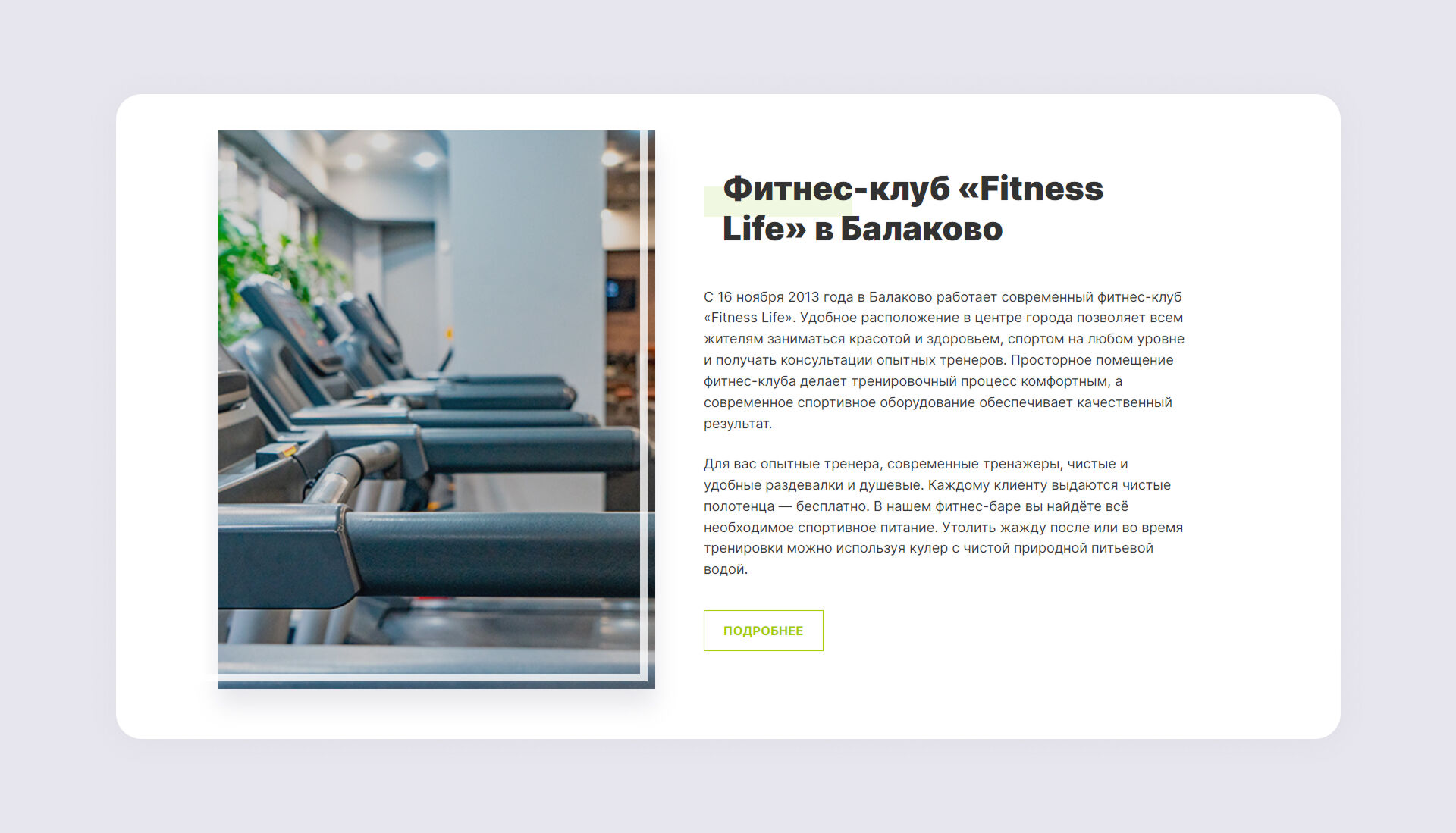 Создать сайт для фитнес клуба в городе Балаково «Fitness Life», который предоставляет информацию о услугах, персонале и преимуществах.