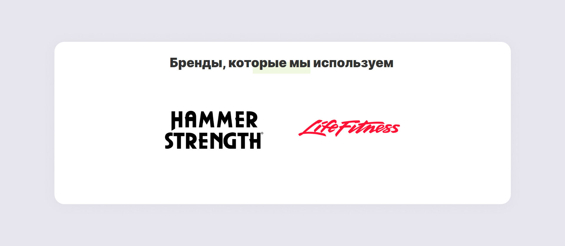 Также был добавлен блок с брендами, которые использует «Fitness Life». Мы подчеркнули, то что фитнес-клуб предлагает только высококачественное оборудование от известных мировых брендов, что значительно увеличивает привлекательность сайта. Клиенты стремятся заниматься на надежном и современном оборудовании.