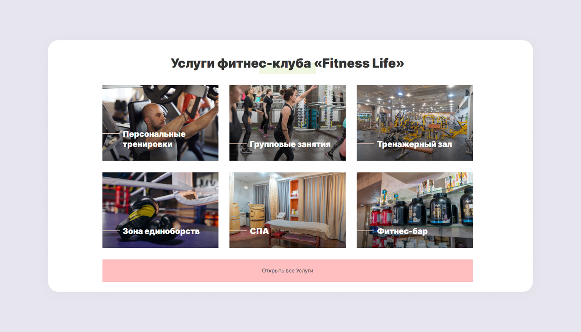 Ниже мы разместили услуги, которые предоставляет фитнес-клуб. Размещение услуг на главной странице позволяет клиентам быстро и удобно ознакомиться с имеющимися предложениями и выбрать подходящие программы тренировок.