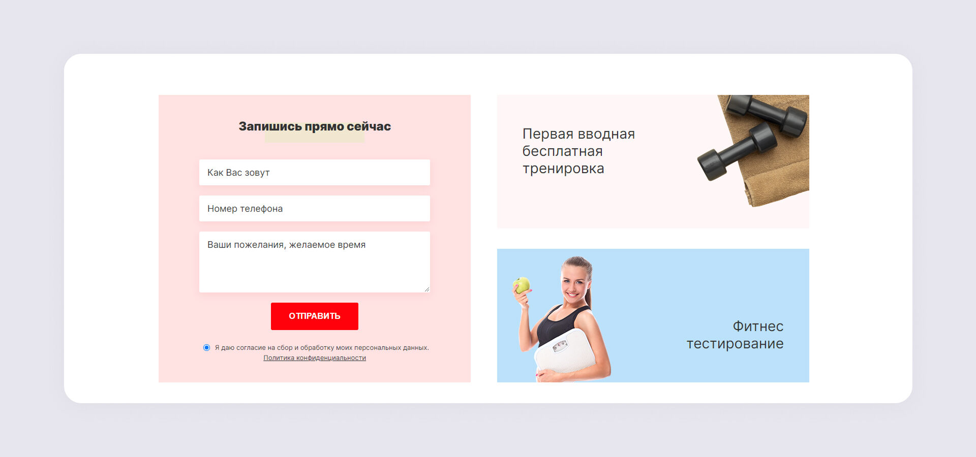 Дополнительно вывели контактную форму для записи на услуги, чтобы сделать процесс взаимодействия с потенциальными клиентами более удобным и быстрым, а также в дополнение разместили информацию о первой вводной тренировке.
