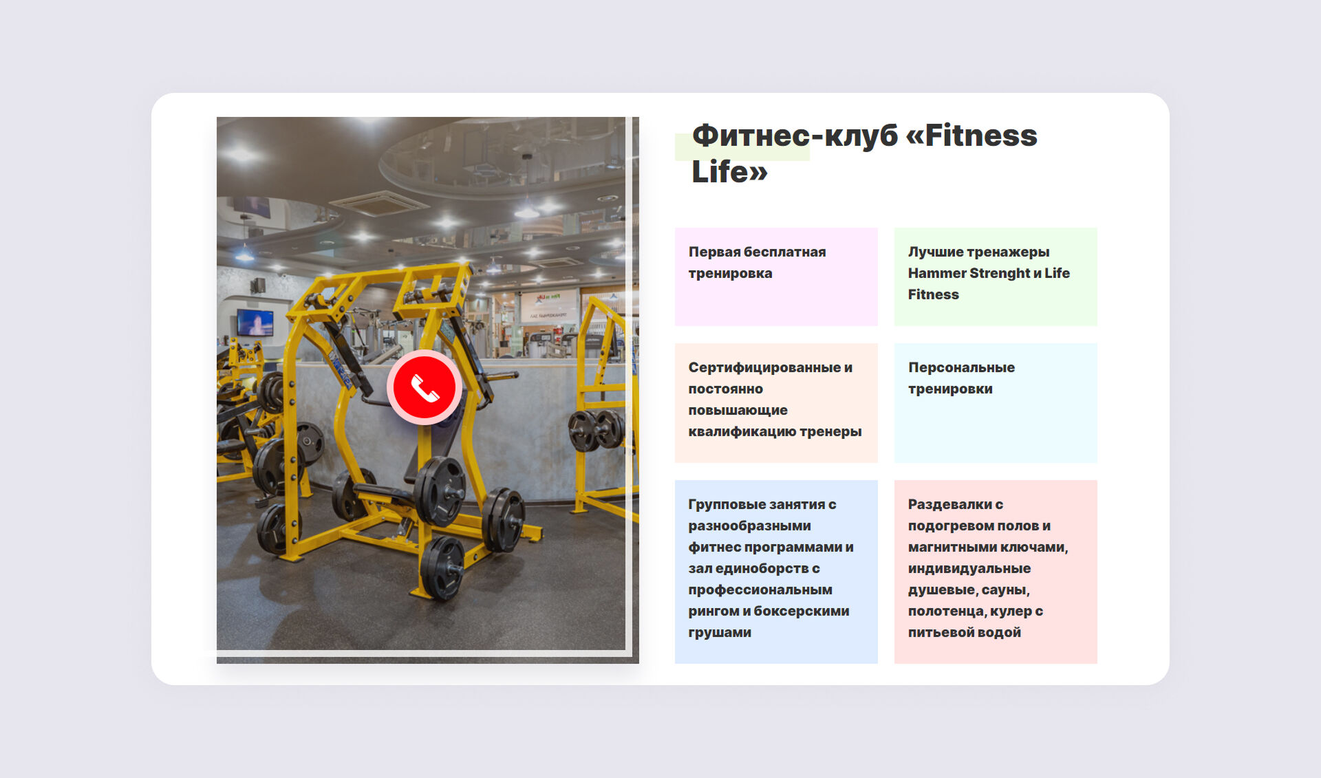 На странице мы разместили раздел с ключевой информацией, который подчеркивает основные преимущества посещения данного фитнес-клуба.