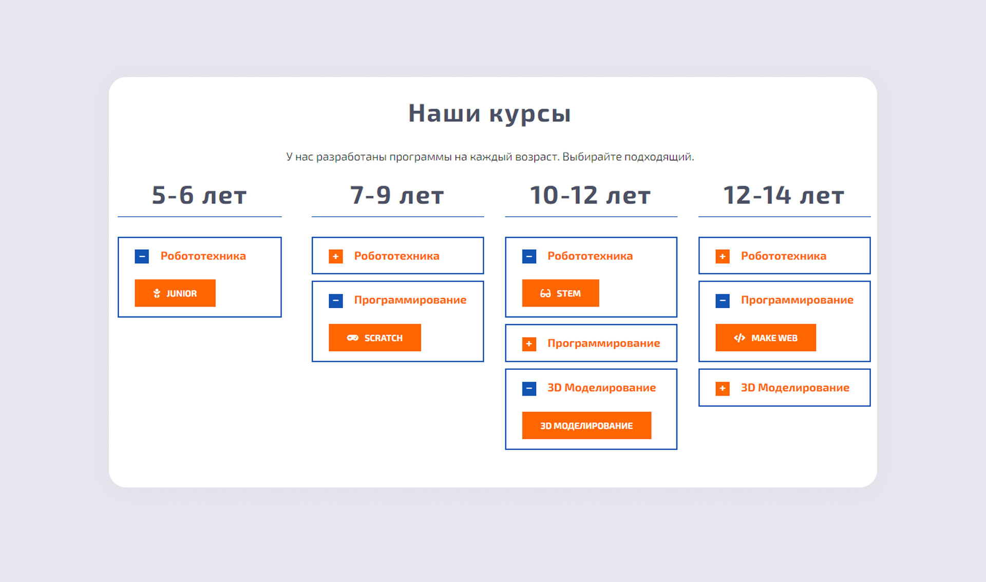 На сайте понятно и лаконично описаны курсы и их удобно подбирать по возрасту ребенка.