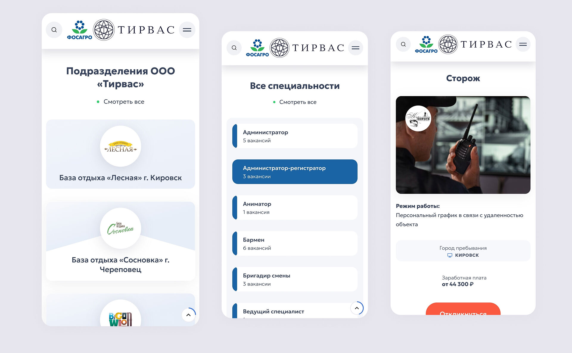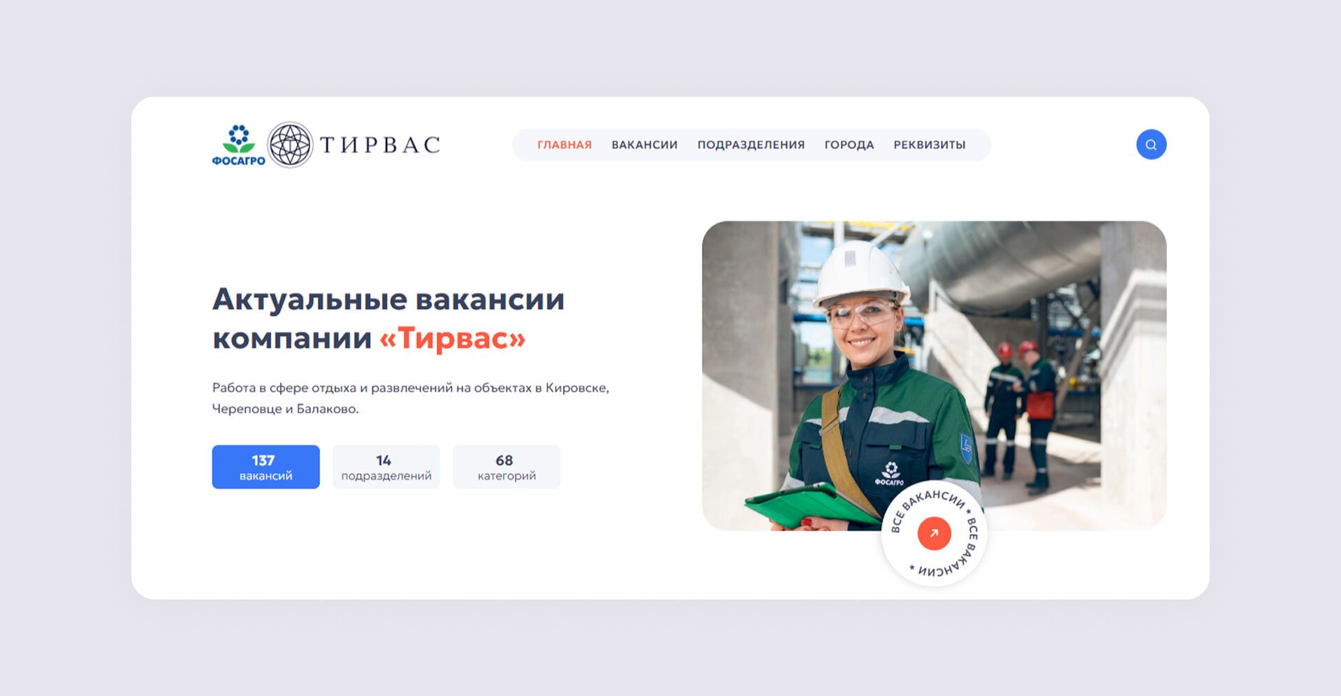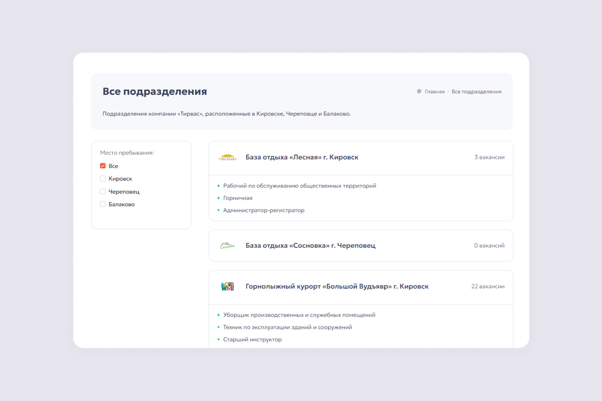 Поскольку на сайте представлены вакансии из различных подразделений компании, мы создали блок с соответствующим названием «Подразделения». Этот блок также облегчает поиск.