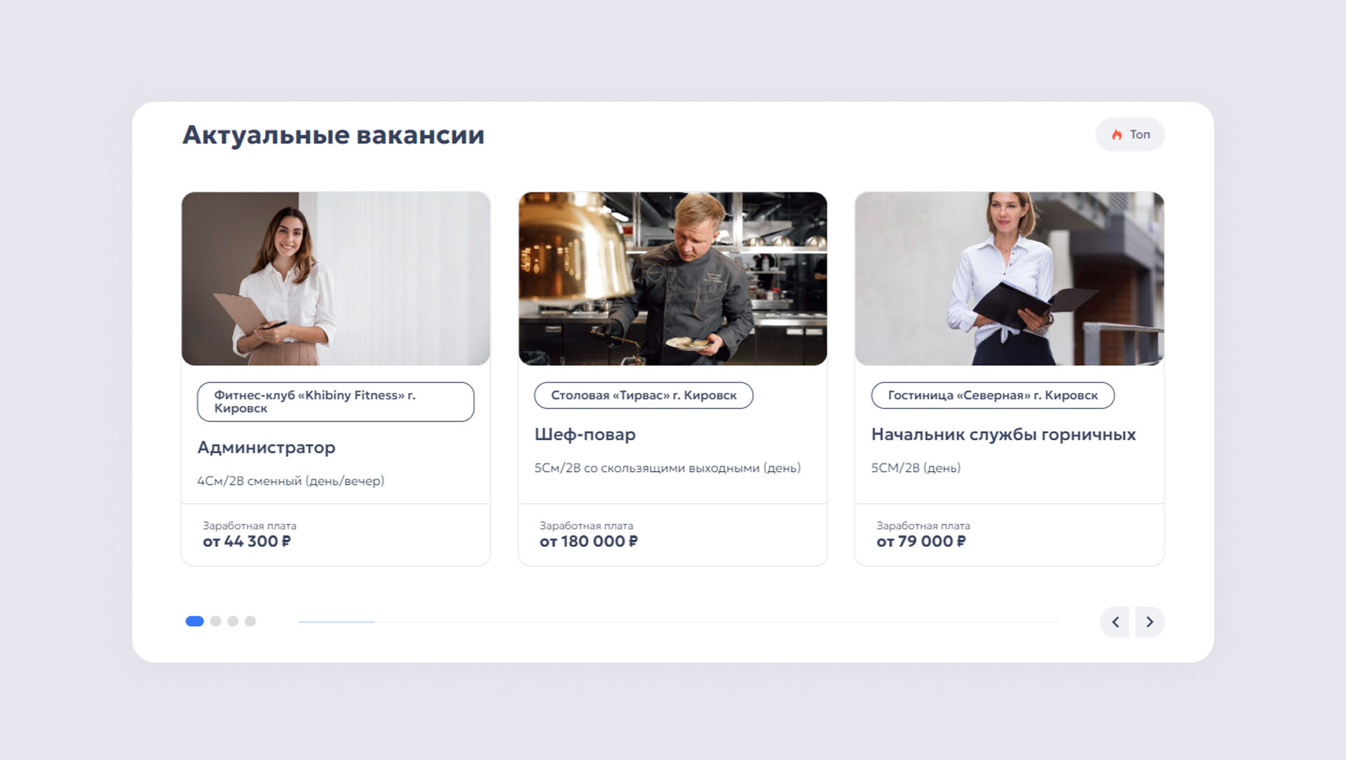 Следующий блок показывает актуальные вакансии. При заинтересованности в конкретной вакансии пользователь может легко перейти к подробной информации, что значительно упрощает процесс поиска и выбора.
