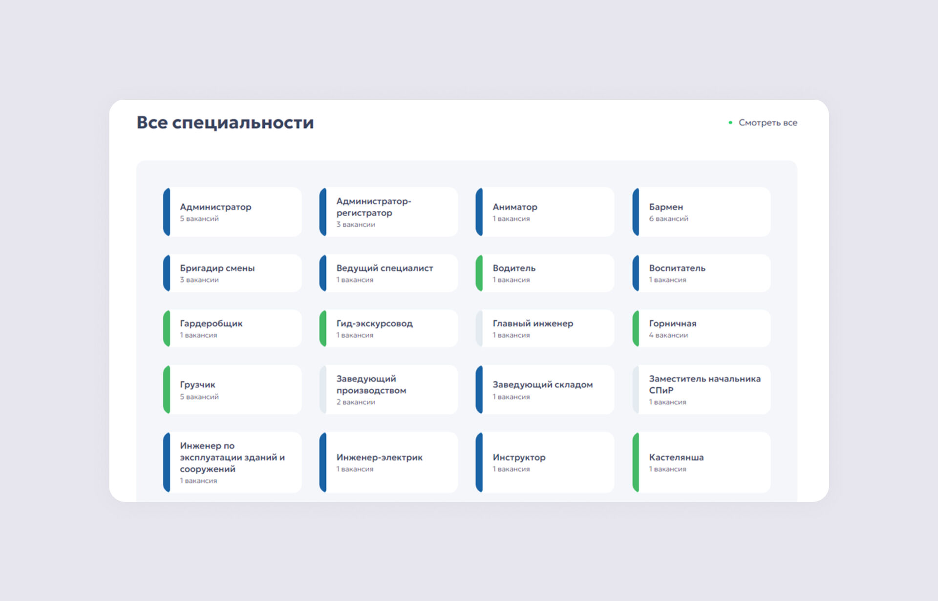 Для того, чтобы пользователь мог подбирать интересующую его вакансию по специальности, мы создали следующий блок. Это позволяет соискателям ориентироваться и подбирать вакансии, соответствующие их навыкам и интересам.