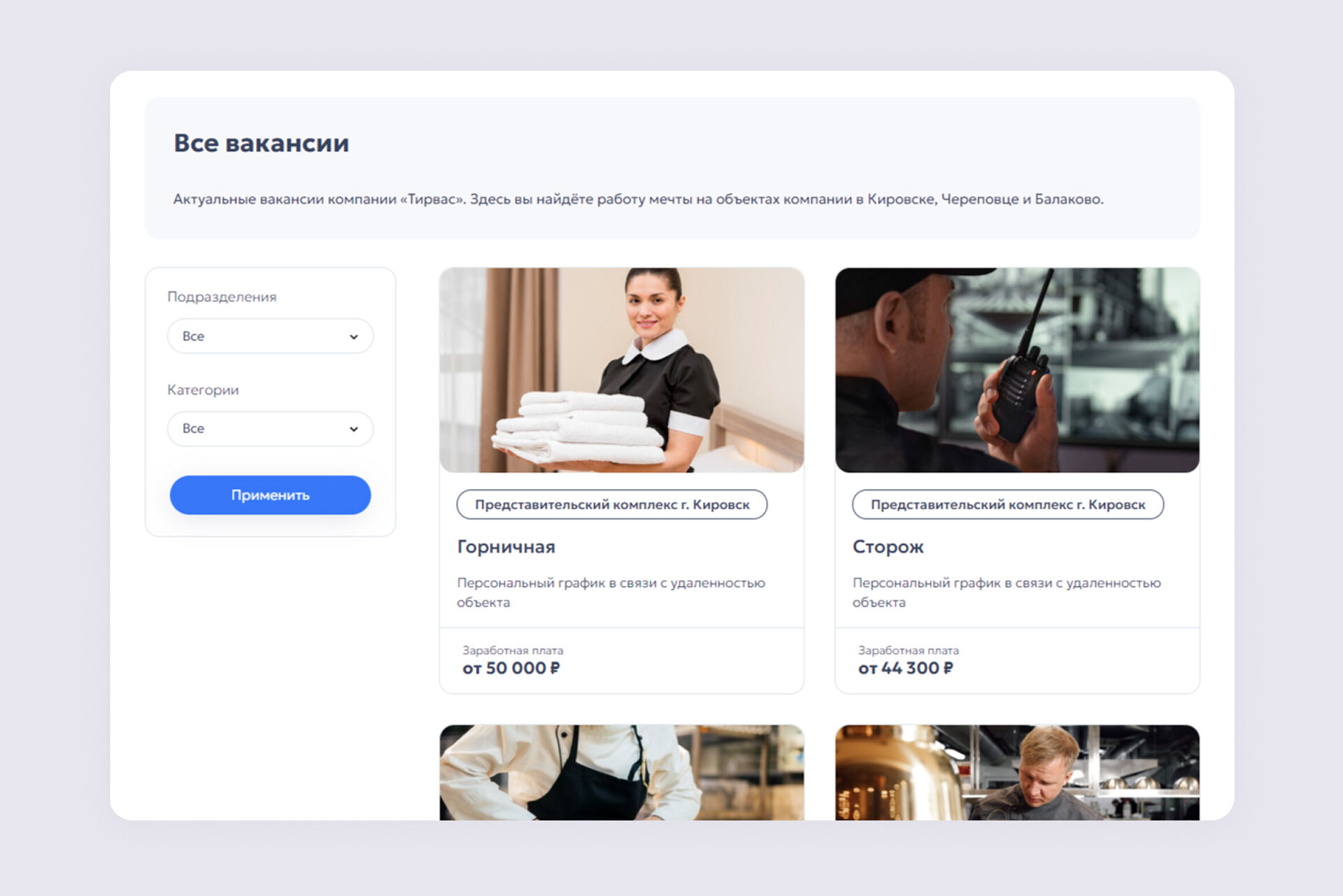 На данной странице представлен полный перечень вакансий. Кроме того, предусмотрена удобная система фильтрации по таким параметрам, как подразделение и категории, чтобы помочь пользователю сузить поиск и найти именно ту позицию, которая соответствует его интересам и квалификации.