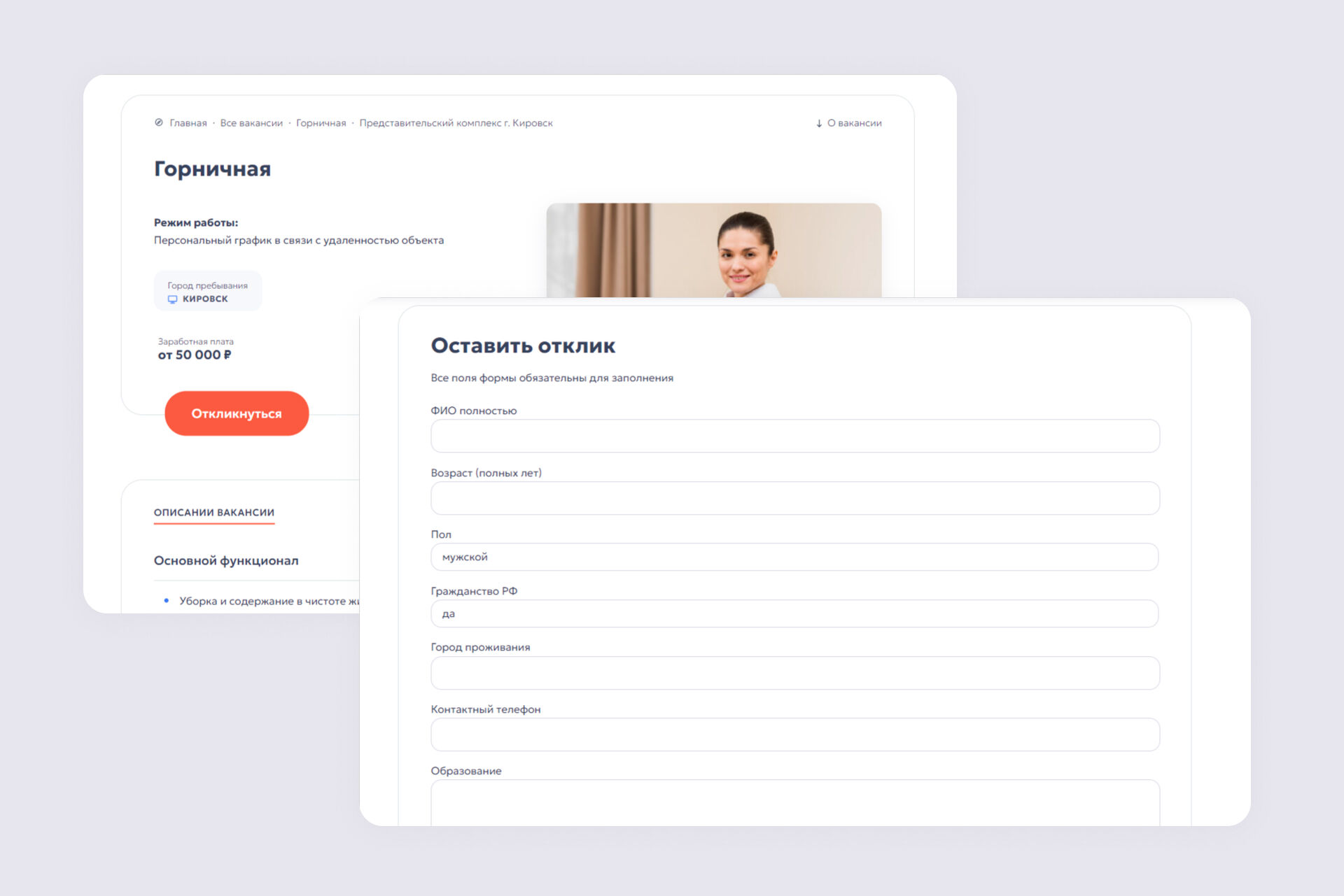 При клике на ту или иную вакансию пользователя встречает подробная информация о ней, включая описание должностных обязанностей, требования к кандидатам и условия работы. Также предусмотрена возможность откликнуться на вакансию через заполнение удобной контактной формы.