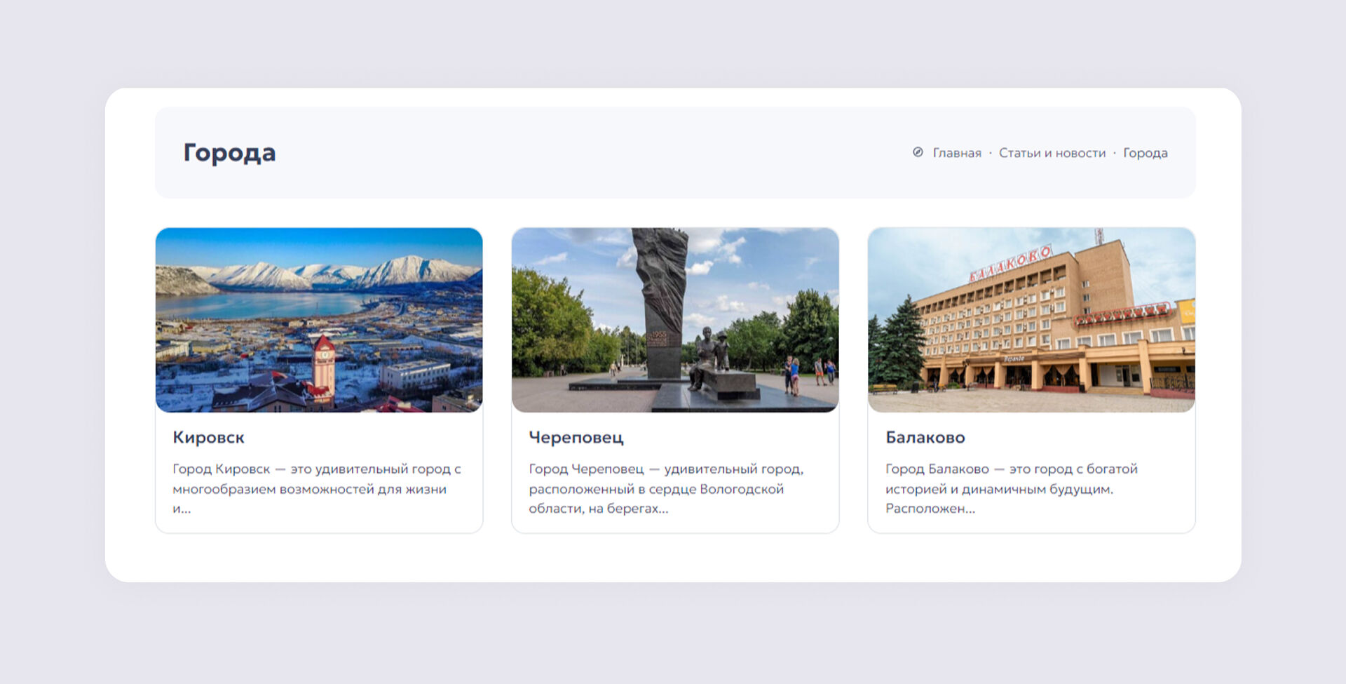 Для тех, кто хочет более подробно ознакомиться с городами, в которых размещаются подразделения, добавили соответствующую вкладку. Информация о городах, достопримечательностях, преимуществах жизни и работы в них. Данный блок является дополнительным аргументом в пользу того или иного выбора.