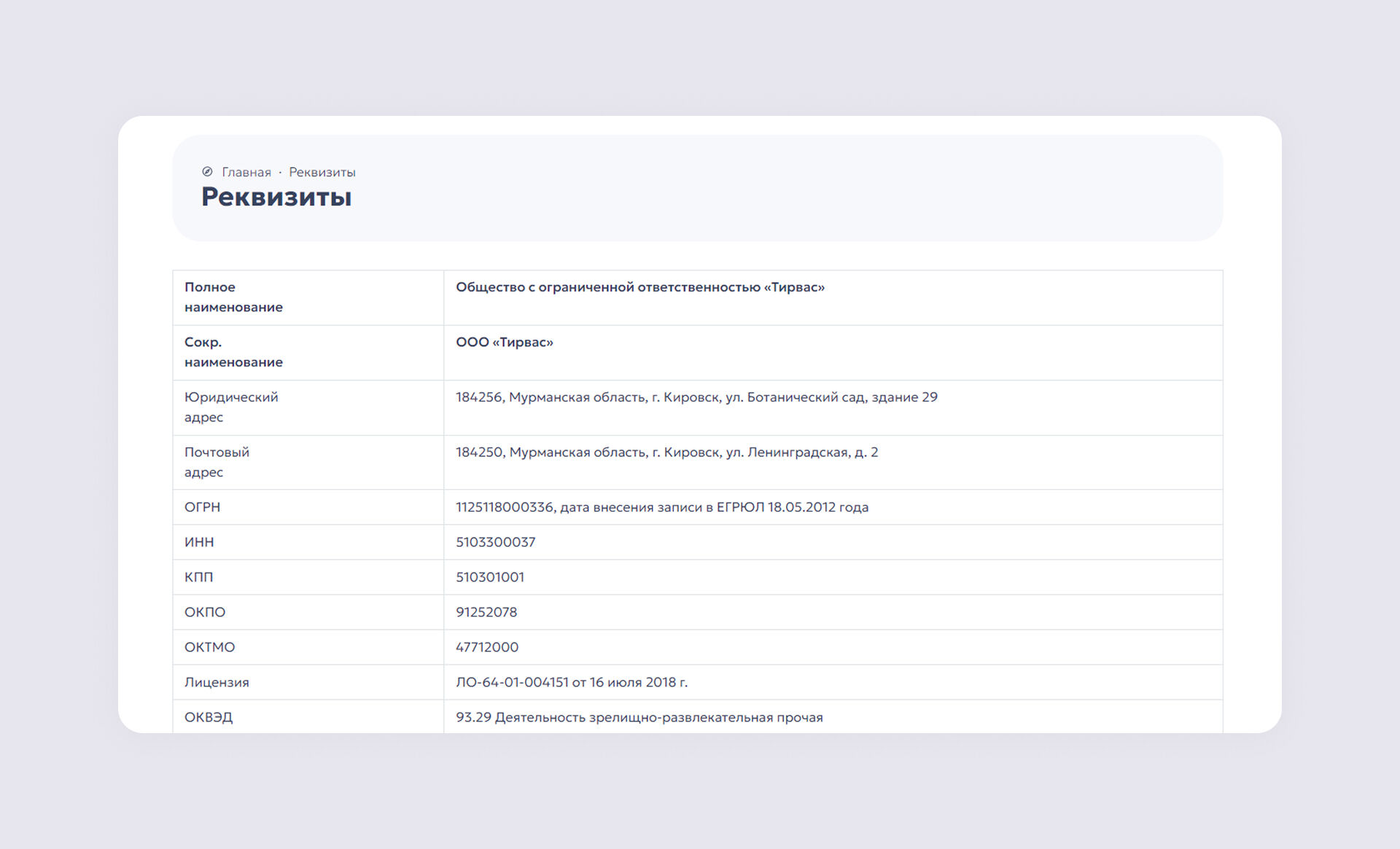 Последняя вкладка «Реквизиты» содержит важную информацию, необходимую для успешного взаимодействия с компанией. Здесь пользователь найдет её юридический адрес, банковские реквизиты, контактные телефоны и электронную почту.