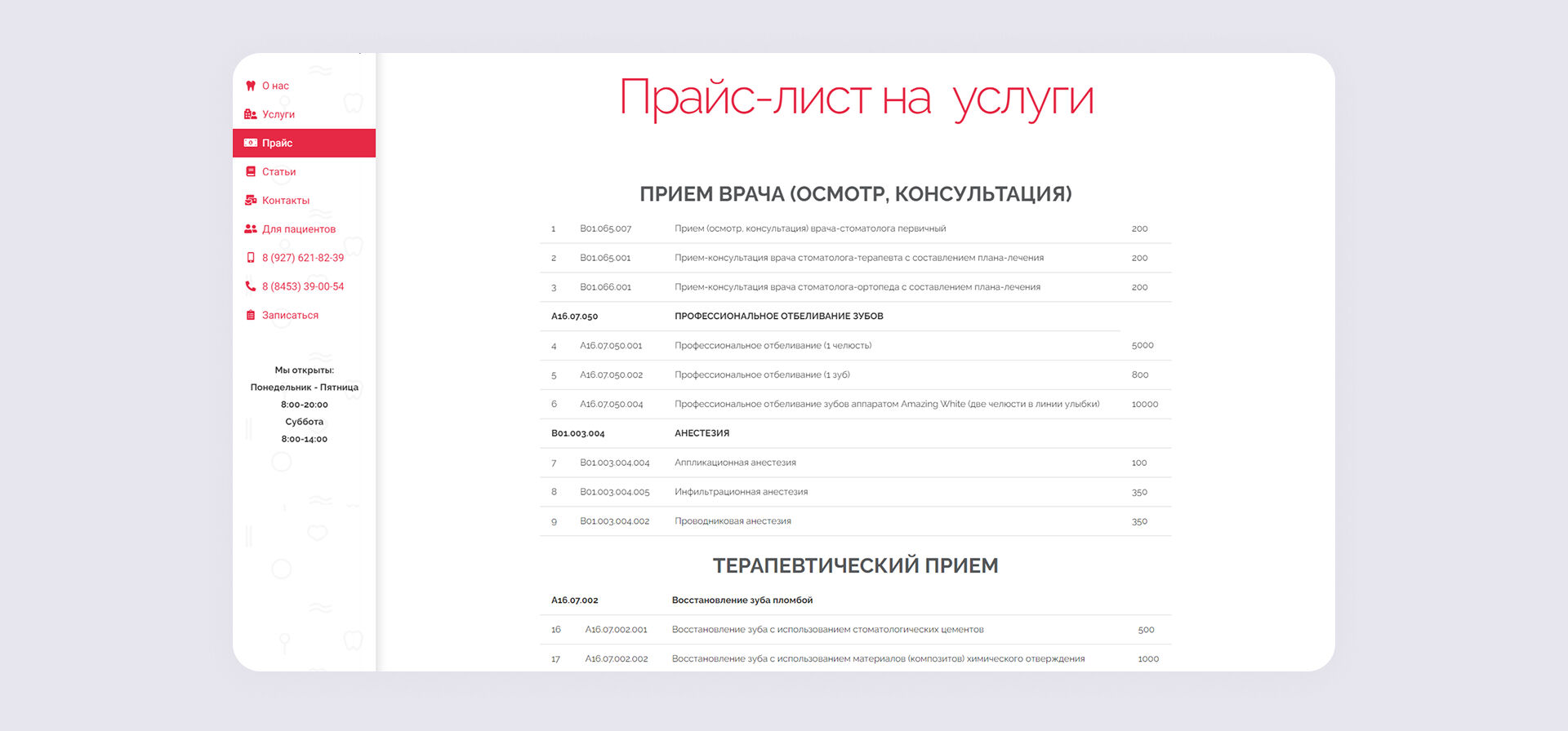 В целом, сайт стоматологической клиники должен содержать информацию о услугах, ценах, персонале и контактные данные.