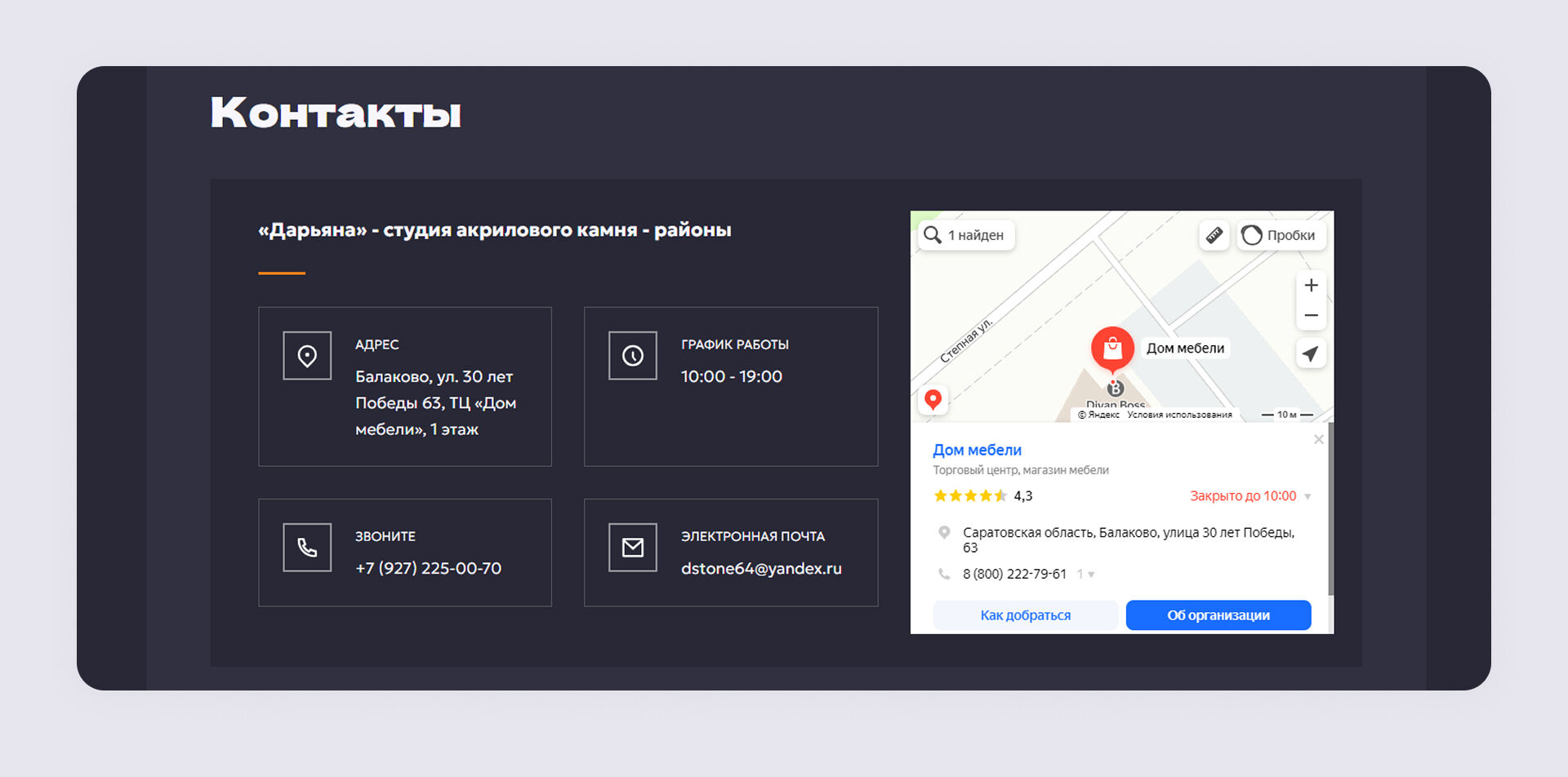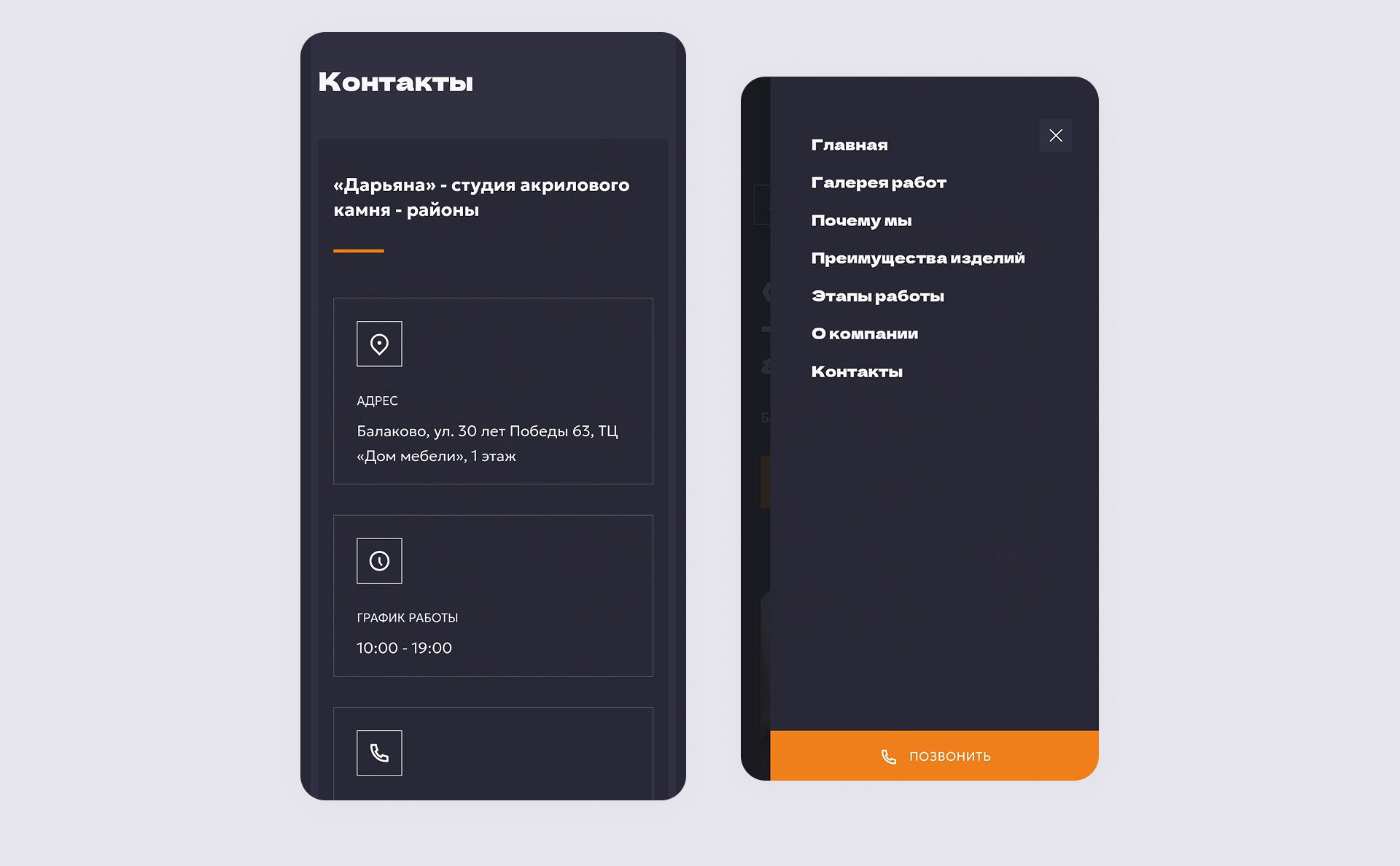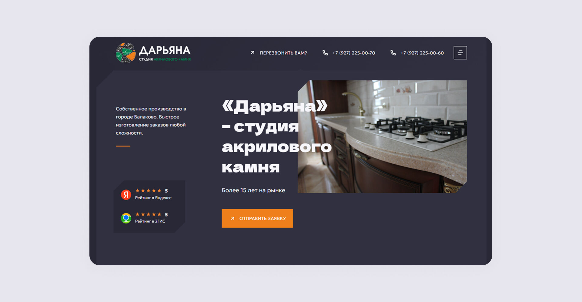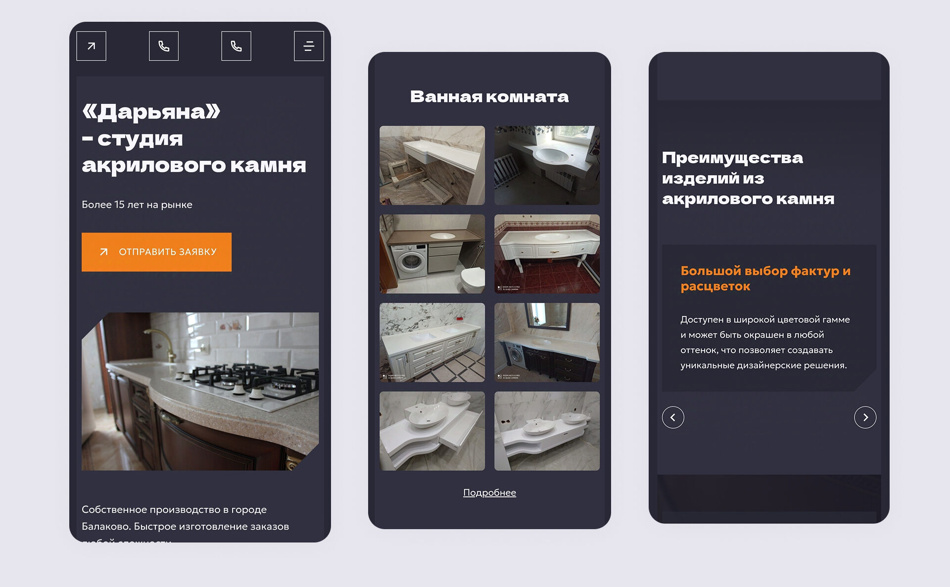 Согласно статистике, большая часть интернет-пользователей предпочитает посещать сайты с мобильных устройств. Мобильная версия сайта студии акрилового камня «Дарьяна» в Балаково предлагает интуитивно понятный интерфейс и адаптивный дизайн.