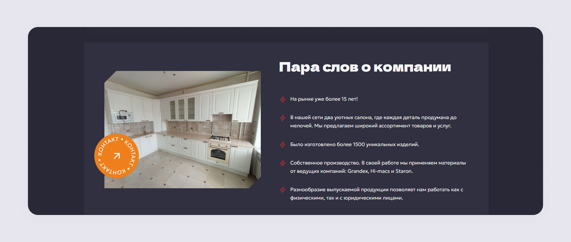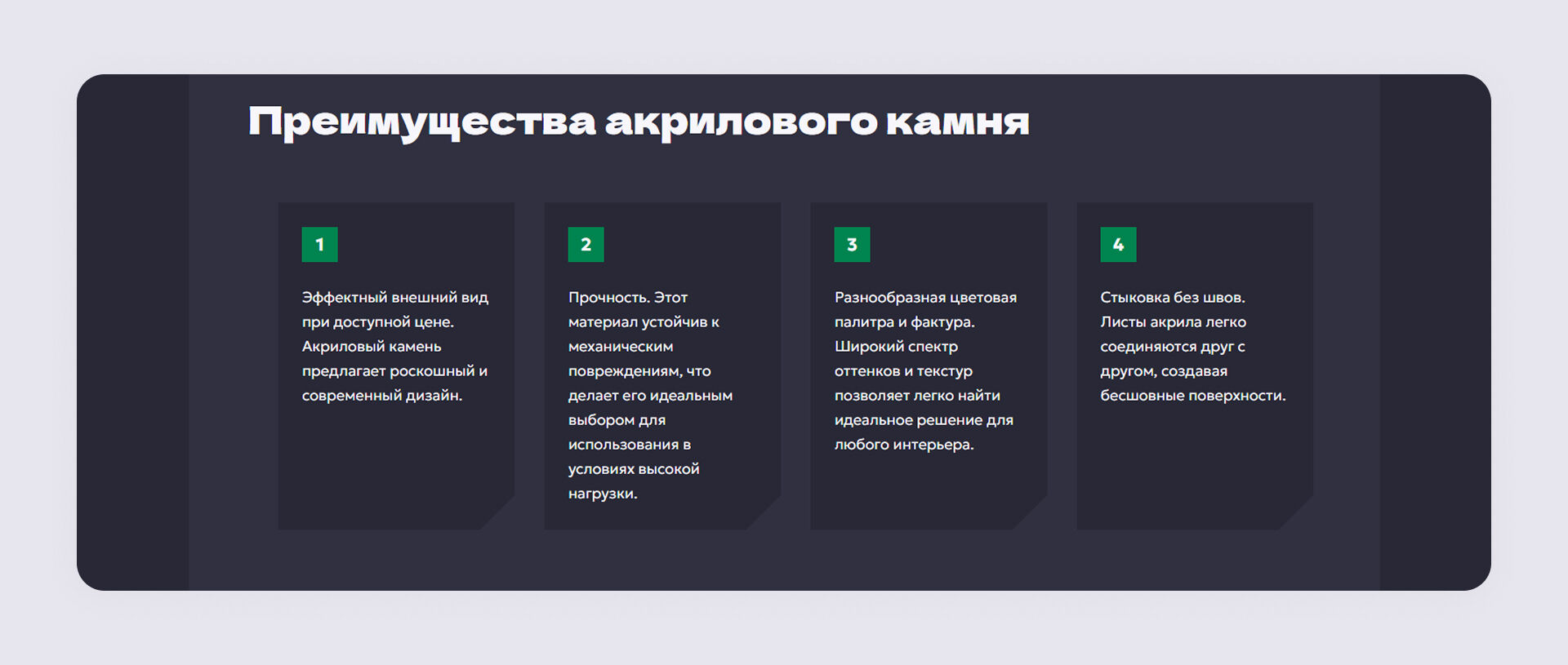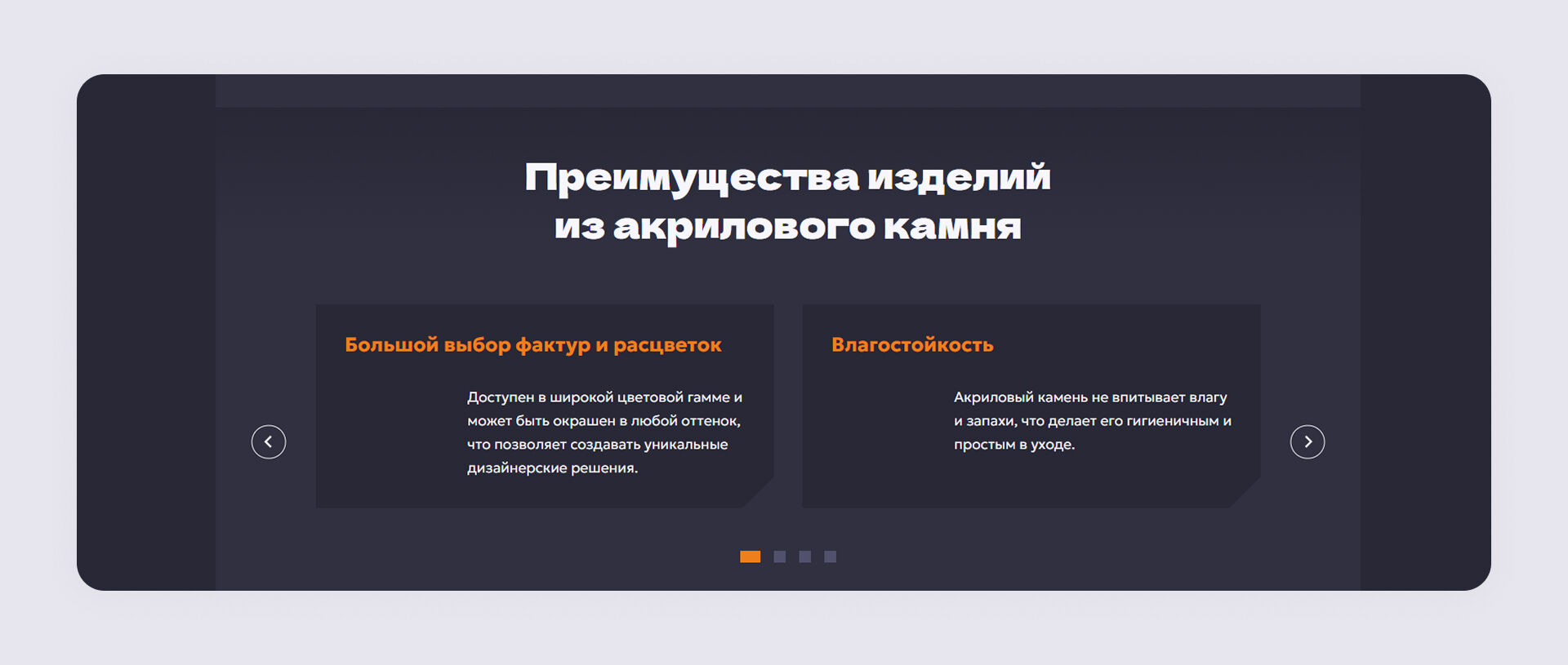 Следующий блок «Преимущества» компании. Здесь мы выделили сильные стороны студии акрилового камня «Дарьяна»: разнообразный ассортимент, собственное производство, бесплатная доставка, материалы от ведущих компаний. Блок преимуществ компании помогает пользователю сделать осознанный выбор.