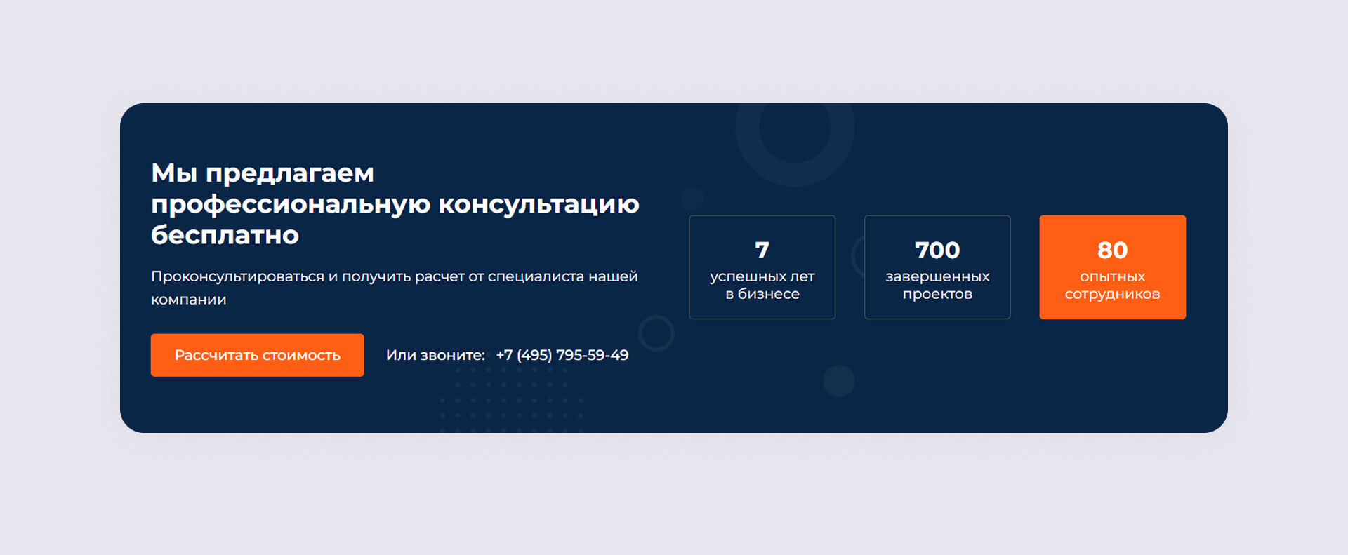 На Главной странице сайта информационные блоки гармонично чередуются с формами Призыва к действию. Это гарантирует легкий доступ к контактной информации и делает процесс связи более удобным, оставаясь всегда на виду.