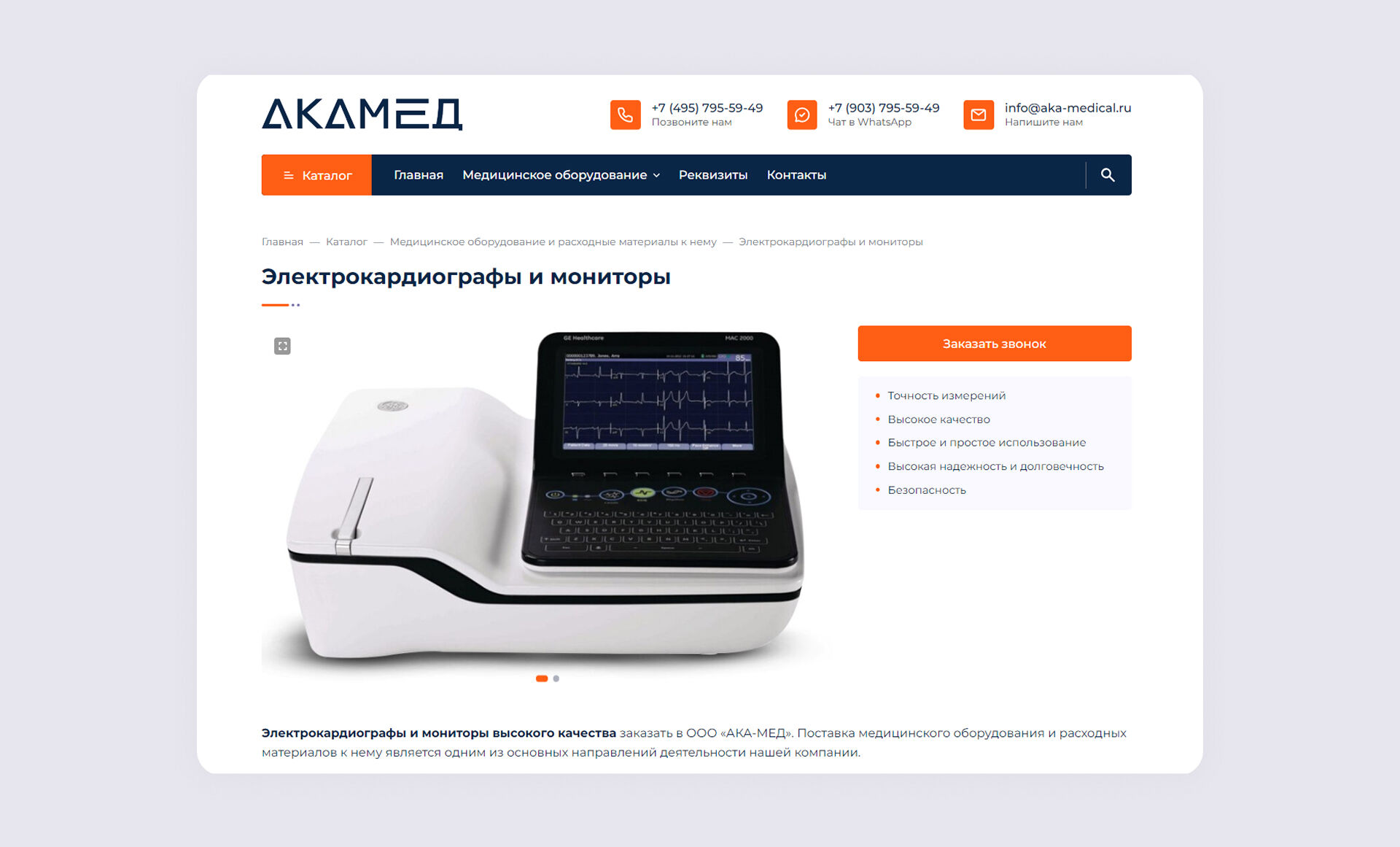 Основной задачей было создание интуитивно понятного и удобного сайта, который наглядно демонстрирует весь ассортимент продукции «АКА-МЕД». Мы разработали платформу, которая не только привлекает внимание пользователей, но и обеспечивает легкий доступ ко всей имеющейся информации. Сайт отражает уникальные характеристики и преимущества представленной на нём продукции, создает положительное впечатление и вовлекает.