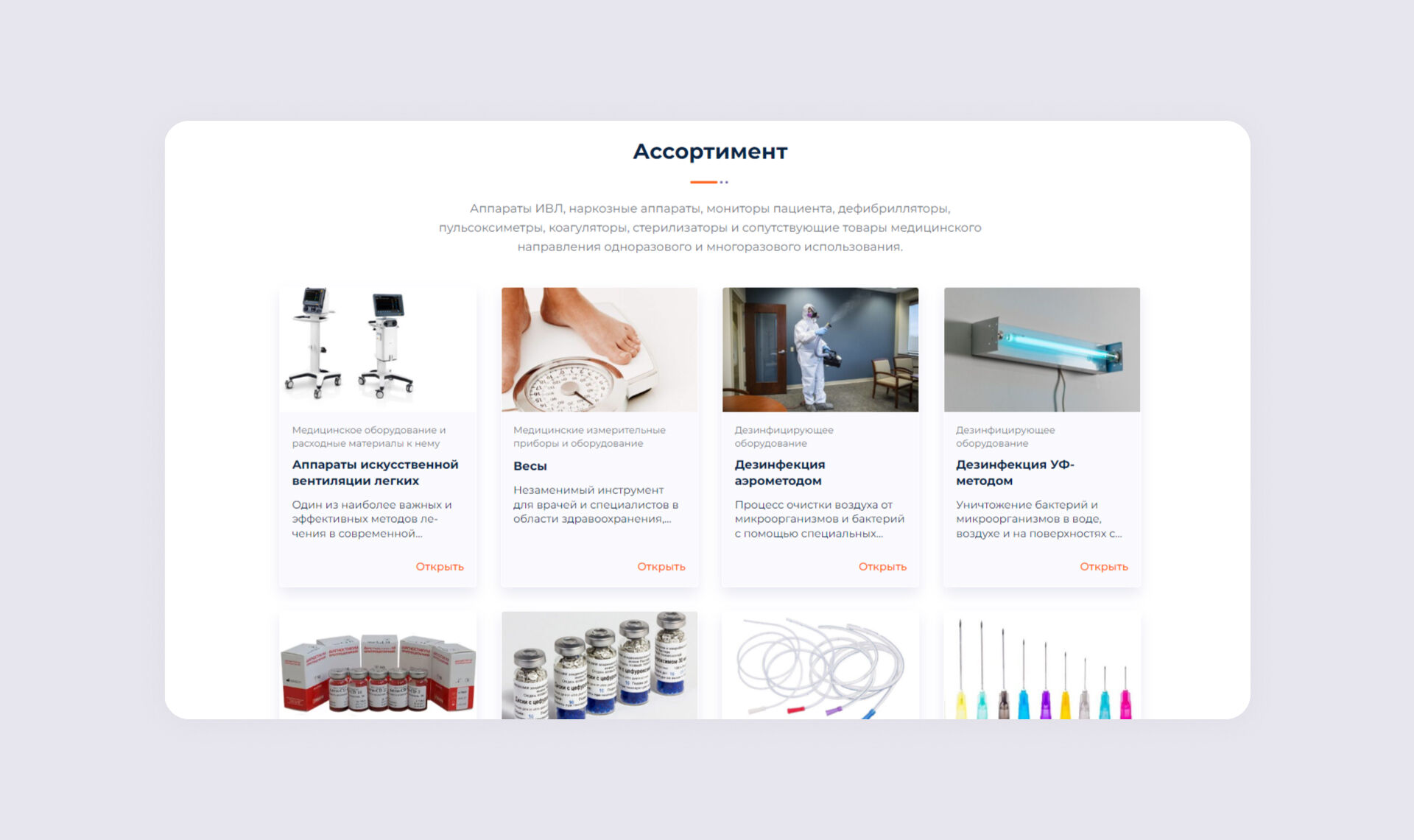 Чтобы максимально полно представить все товары, на Главной странице сайта также был введен раздел Ассортимент. Это позволяет пользователю ещё более подробно ознакомиться с разнообразием предлагаемой продукции в одном месте.