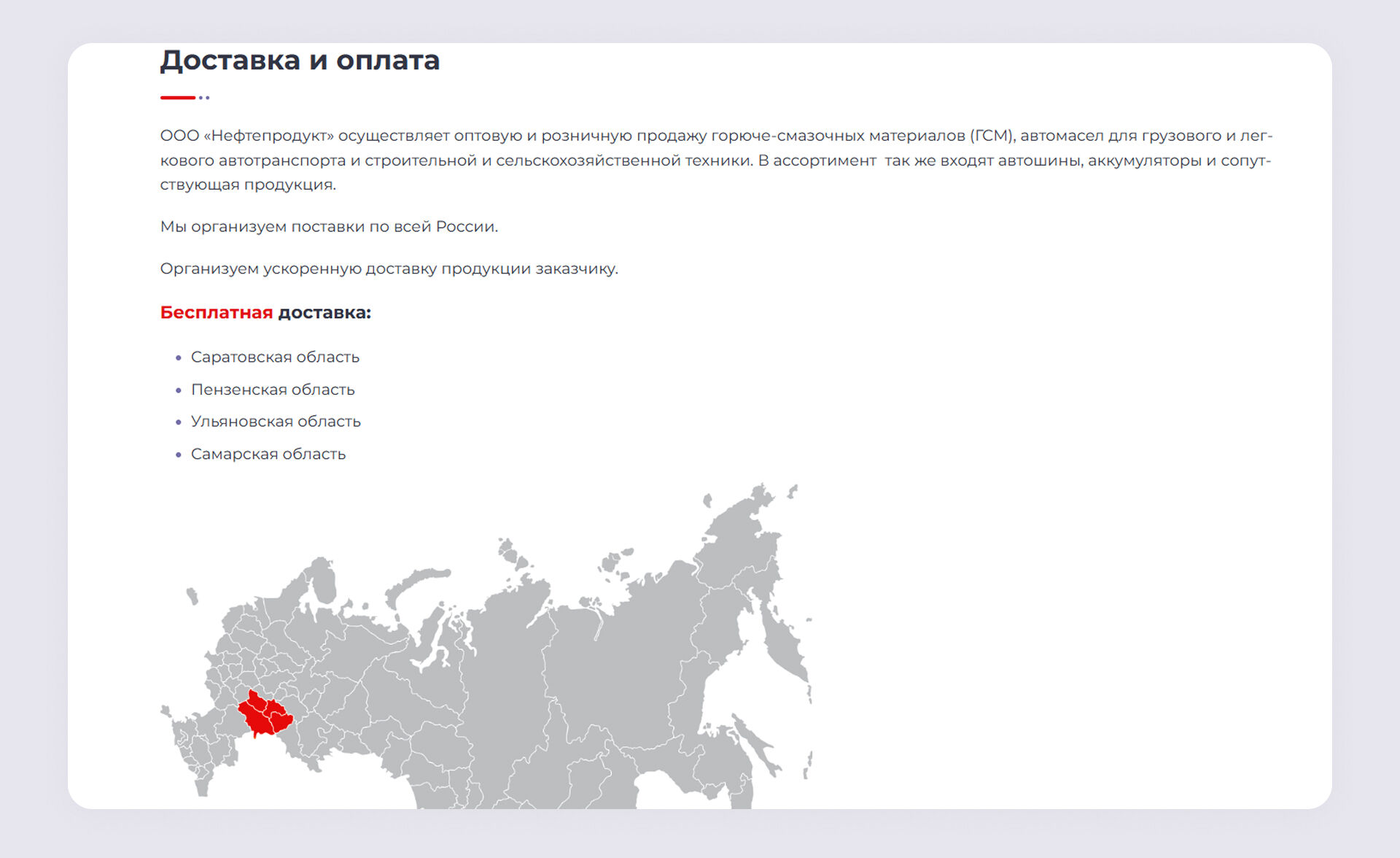 «Доставка и оплата» содержит основную информацию, а также информирует о бесплатной доставке: