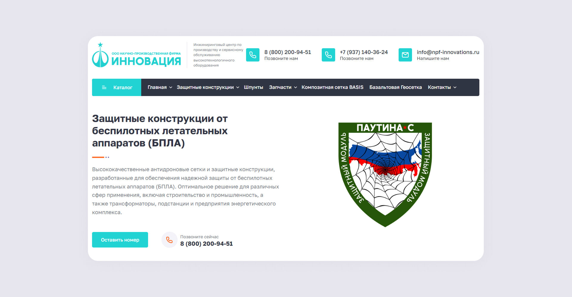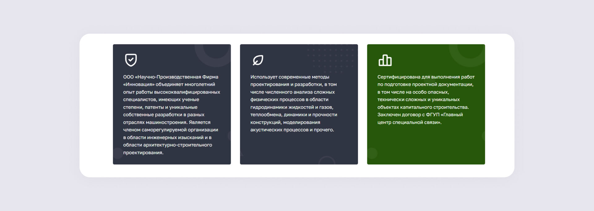 На главной странице был размещён блок преимуществ. Этот раздел не только привлекает внимание посетителей, но и помогает понять, почему стоит выбрать именно НПФ «Инновации». Выделили основные преимущества в виде иконок и краткого описания к ним, чтобы информация легко воспринималась и запоминалась.