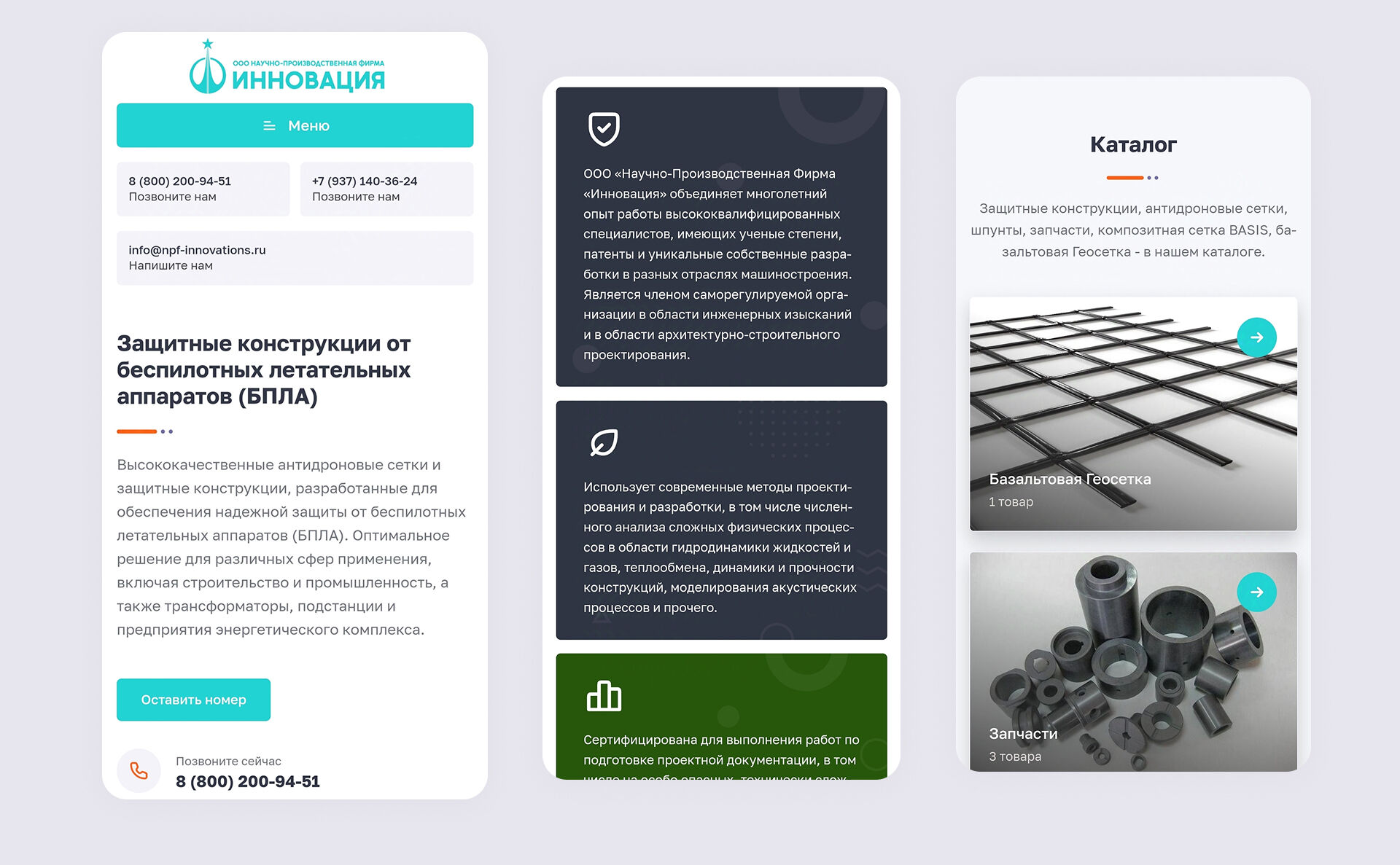 Согласно статистике, значительная часть интернет-пользователей предпочитает посещать сайты с мобильных устройств. При разработке сайта ООО «НПФ «Инновации» были учтены все нюансы, которые могли бы повлиять на пользовательский опыт в мобильной версии.
