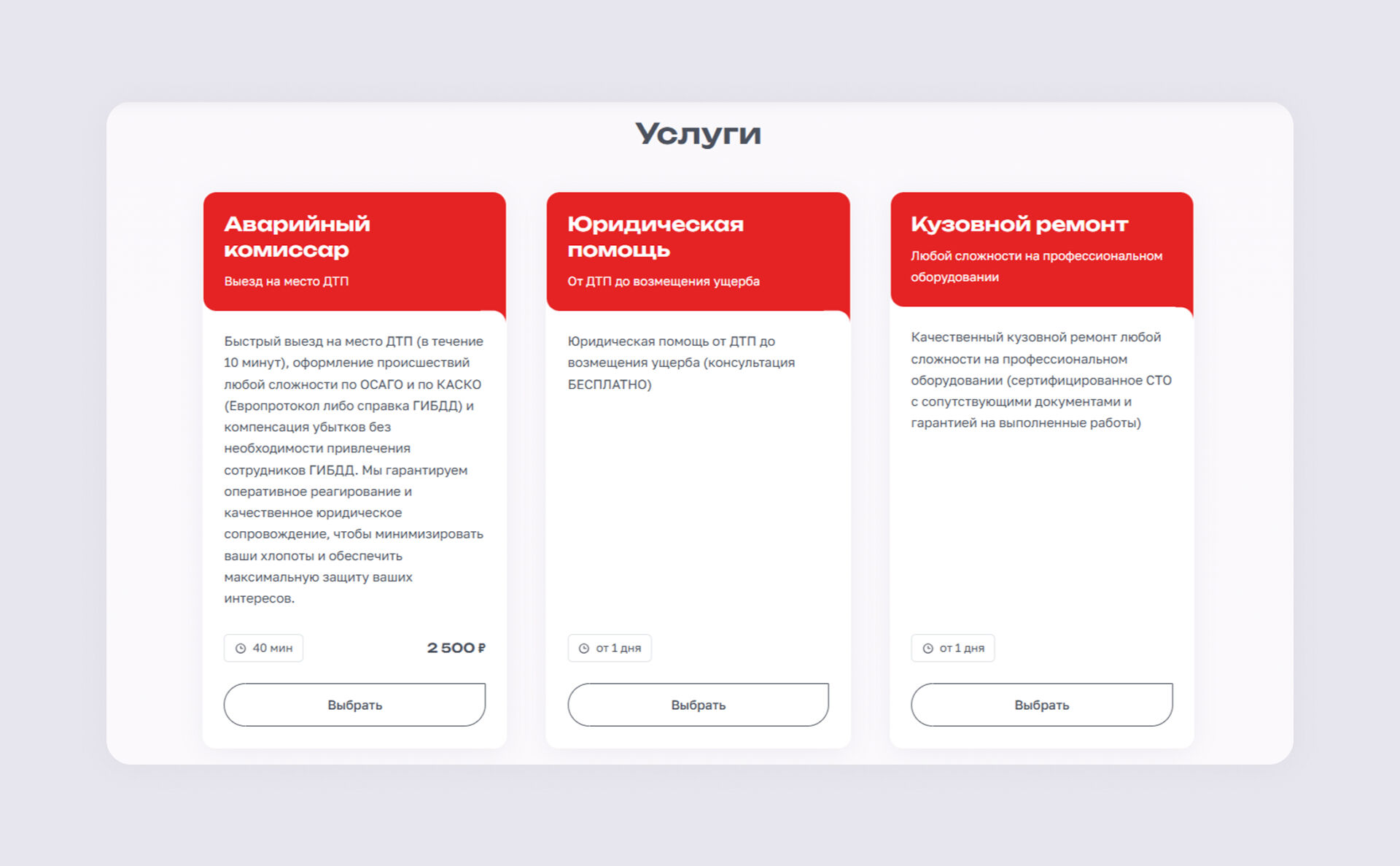Добавили раздел с услугами, их стоимостью и описанием. Это позволяет пользователю быстро и удобно ознакомиться с предложениями и выбрать наиболее подходящее решение. Помимо этого, в каждой «Услуге» есть кнопка «Выбрать», при нажатии на которую пользователь переходит к форме выбора звонка или отправки сообщения.