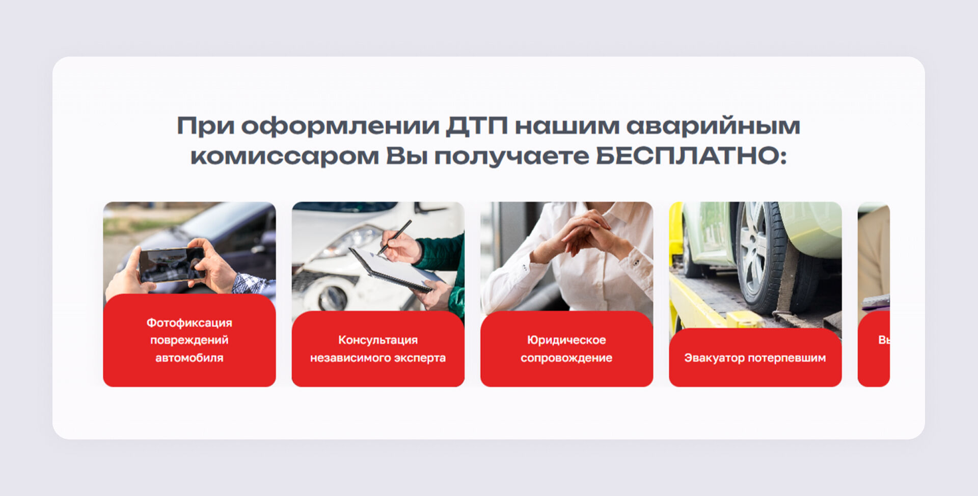 Чтобы сделать услугу вызова аварийного комиссара более привлекательной, мы добавили карусель, показывающую, что потенциальный клиент получит бесплатно при вызове.