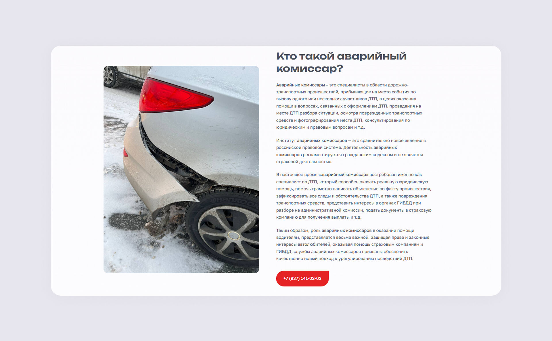 Ниже разместили информативный блок «Кто такой аварийный комиссар», в котором подробно описали его функции и обязанности.